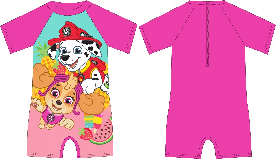 комбінат для ванни з дуже приємним вирізом, яскравими кольором, з великим принтом героїв з казкової патрульної казки на передній панелі. Комбінезон з хороших якості матеріалів, він підходить і розтягнутий, завдяки якому він зручно носити. Закріплений блискавкою ззаду.