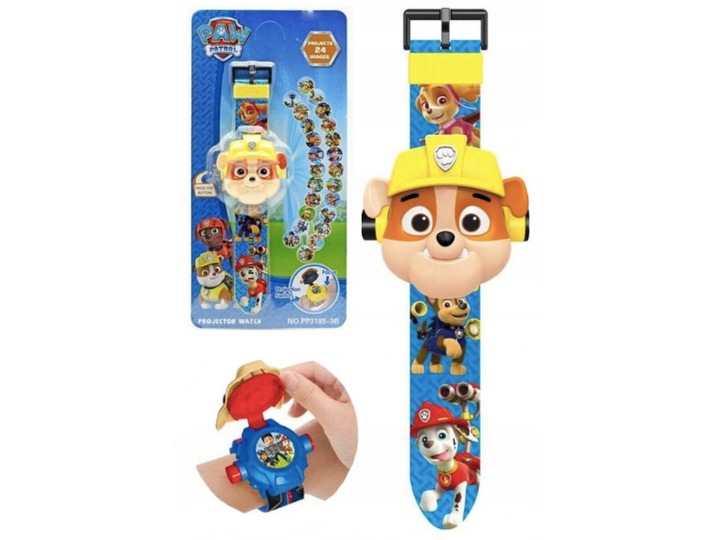 Чудовий годинник для дітей із проектором! Проектор демонструє аж 24 картинки з героями відомої казки «Псі Парол». Утримуйте кнопку збоку годинника, щоб переглянути зображення, а потім відрегулюйте фокус за допомогою диска.