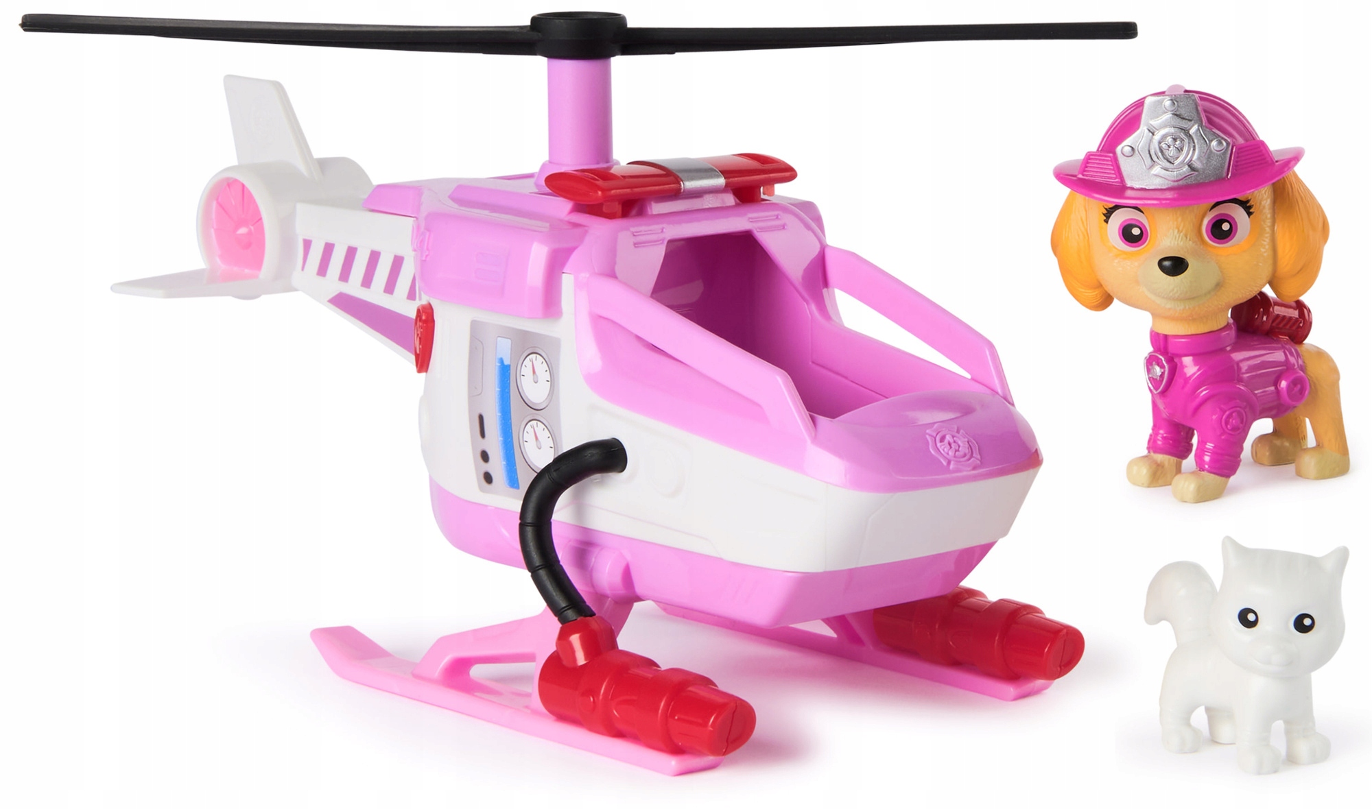 Набір включає пожежно-рятувальний гелікоптер і фігурку із зображенням собаки Скай. Статуетка є точною копією героя фільму, він одягнений у рожеву куртку та рюкзак, а на голові у нього рожева пожежна каска. Фігурка має рухливу голову. Гелікоптер біло-рожевий з червоно-чорними елементами. Має дві лижі, завдяки яким можна легко приземлитися на будь-яку будівлю, і обертовий пропелер.