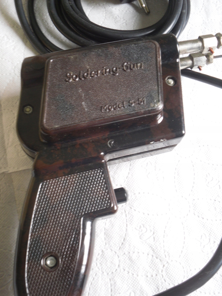 Ласкаво просимо на мій аукціон. На аукціонах я зазвичай пропоную вам речі часів Польської Народної Республіки. На цьому аукціоні я пропоную ОРИГІНАЛ старого паяльного пістолета Model 5-51 "AUDION" Amsterdam. Паяльник цілий, корпус здається бакелітовий. У пробці є виріз під штифт, але над ним потрібно попрацювати. Паяльник ПРАЦЮЄ. Паяльник і кабель не пошкоджені, тільки незначні подряпини та потертості. Я додаю олово, яке видно на фотографіях, і дріт для виготовлення жала до паяльника. Він запакований і буде включений в набір, але він в поганому стані і не бере участі в аукціоні. /див. фото/