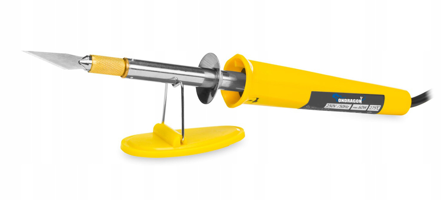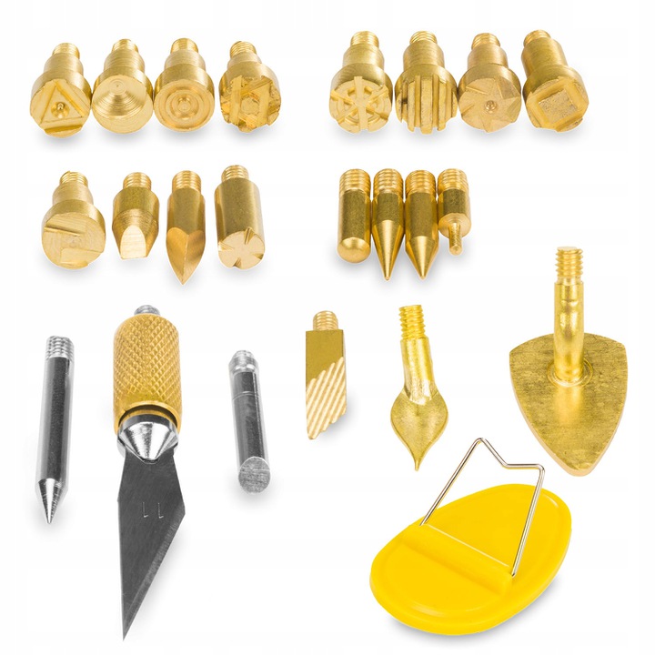 Набір містить 22 наконечники, завдяки яким ми можемо вирізати різні види візерунків на дереві, пробці чи шкірі. Розігрівшись, ніж, що входить у комплект, полегшить різання багатьох матеріалів. Завдяки використанню латуні для наконечників вони дуже швидко нагріваються до робочої температури. У набір також входить підставка для жала паяльника/термопістолета, завдяки якій ви можете безтурботно покласти пристрій.