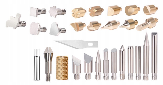 Наконечники виготовлені з латуні, тому вони швидко нагріваються, а робота ефективніша та приємніша. У набір також входять металеві наконечники, які є більш міцними, особливо гострі кінці наконечників.