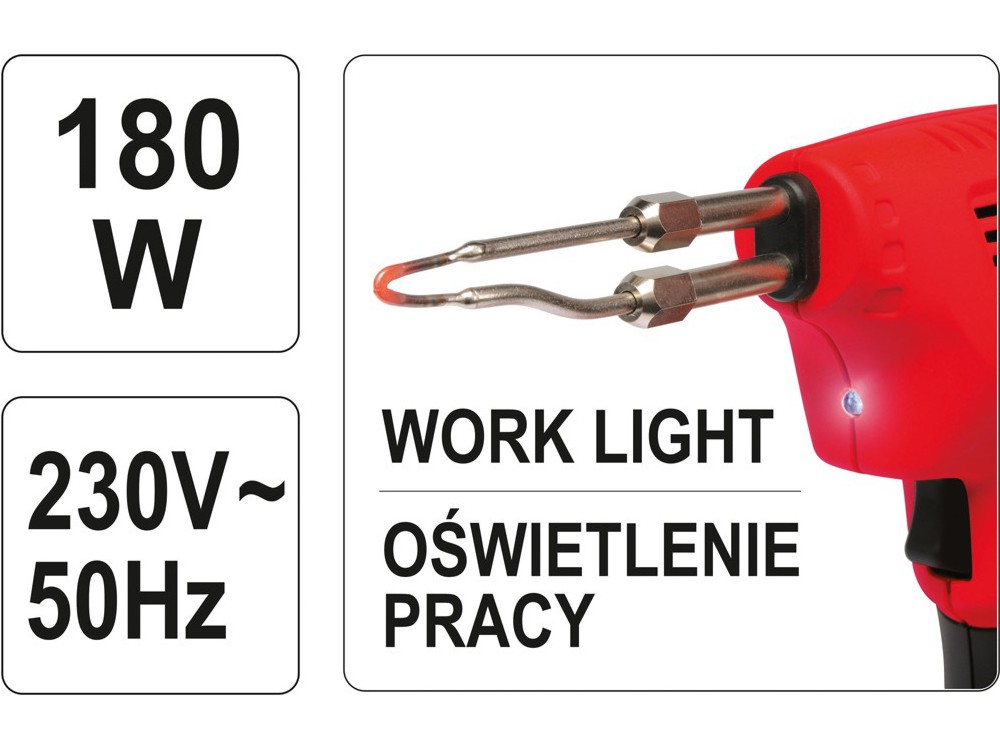 Трансформаторний паяльник YT-8245 дуже високої потужності, виготовлений з високоякісних матеріалів, зберігаючи ергономічну форму. Точкове підсвічування робочої зони і нековзкий матеріал на ручці позитивно впливають на комфорт роботи. Потужність 180 Вт гарантує дуже швидкий нагрів. Паяльнику потрібно приблизно 15 секунд, щоб досягти температури приблизно 350°C за допомогою жала, встановленого вперше. Точкове освітлення полегшує роботу за будь-яких умов.