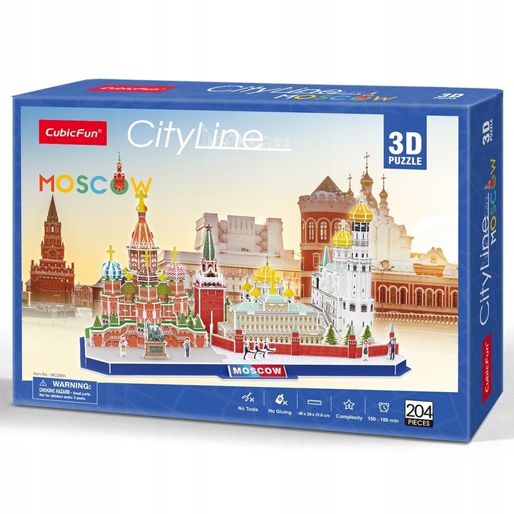 3D PUZZLE CITYLINE MOSCOW - це захоплююча розвага для дітей і дорослих. Cityline – це унікальна лінія від виробника Cubic Fun, яка показує панораму даного міста разом із його найхарактернішими пам’ятками. В упаковці 107 пазлів зі спеціального піноподібного матеріалу. Пазли пронумеровані, розрізані та розміщені на аркушах. Просто без зусиль витисніть елемент з листа і зберіть його відповідно до інструкції, що додається, без використання клею та спеціальних інструментів. Розмір конструкції після складання 53,5 х 16,5 х 26 см. Рекомендований вік дитини: 8+.