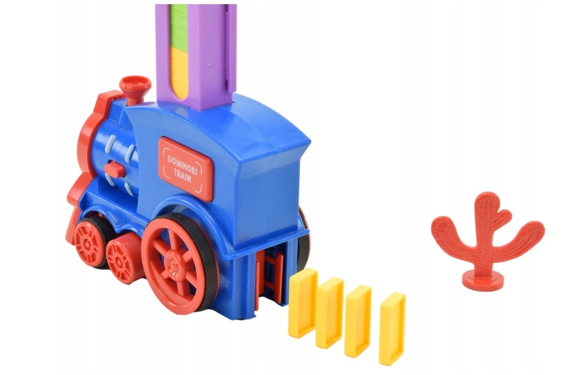 Коли потяг рухається, передня частина випромінює світло та звуковий ефект. Локомотив самостійно розставляє кубики доміно під час руху. За допомогою ручки у верхній частині малюк може самостійно розташувати колію паровозика. Локомотив живиться від двох батарейок АА - після перемикання кнопки в положення ON паровоз буде їхати сам. Дитина буде тренувати координацію рук і очей. Гра з цим потягом принесе багато задоволення та радості кожному малюку.
