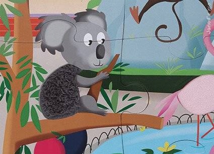 Великий набір сенсорних пазлів від французького бренду Janod. Він складається з 20 елементів. Картина, зроблена з них, показує життя тварин у зоопарку. Дитина також може чуттєво пізнати його мешканців – хутро і шкіра семи істот виготовлені з фактурних матеріалів. Дотик до різноманітних текстур імітує реальні емпіричні відчуття та розвиває дотик дітей. Це також викликає додатковий інтерес до головоломки. Пазли великі, а малюнок у зібраному вигляді становить 65 на 20 см.