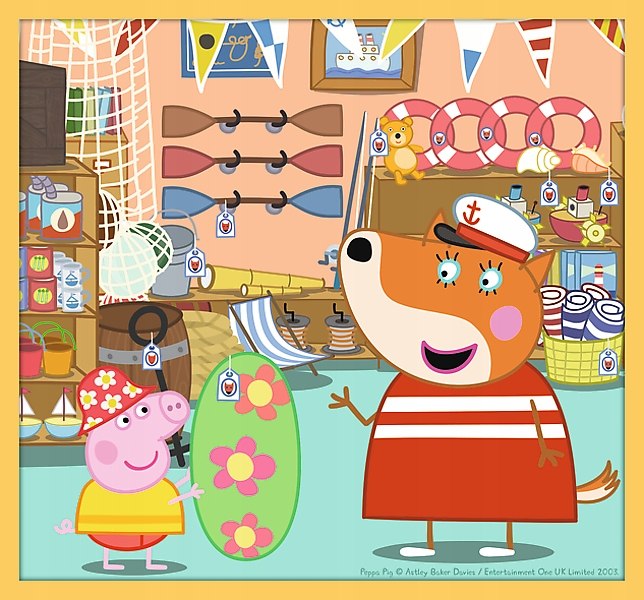 Набір «Мега-набір» складається з 10 окремих пазлів із різною кількістю елементів і різними розмірами зображень із зображенням Свинки Пеппи та її веселої родини під час повсякденної діяльності.