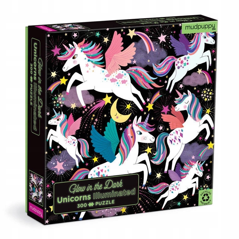 Сімейні пазли, що світяться в темряві Єдинороги американського бренду MUDPUPPY, дають новий вимір розв'язанню головоломок - після складання картинки веселощі не закінчуються.