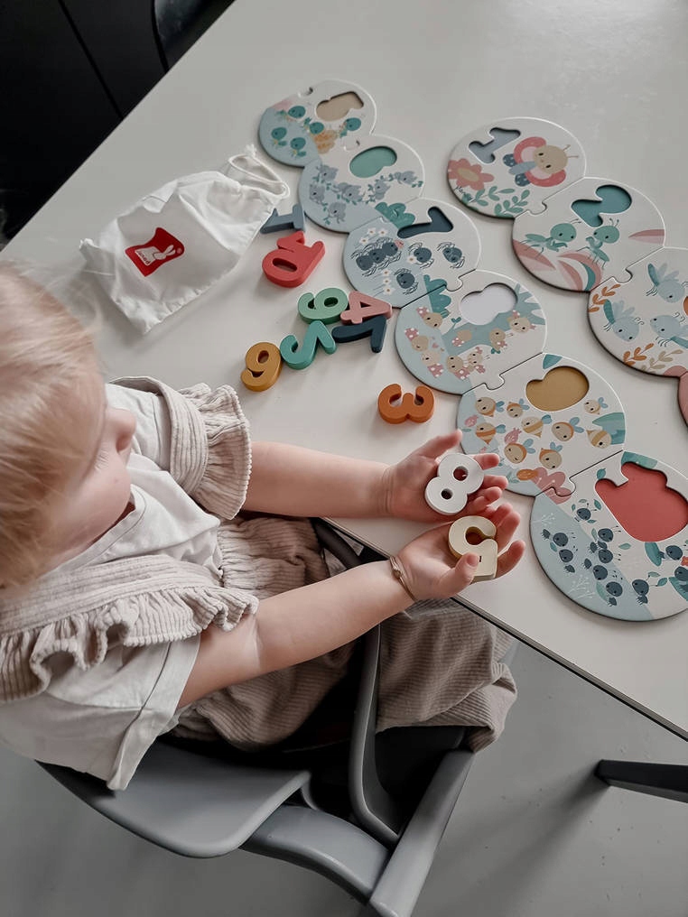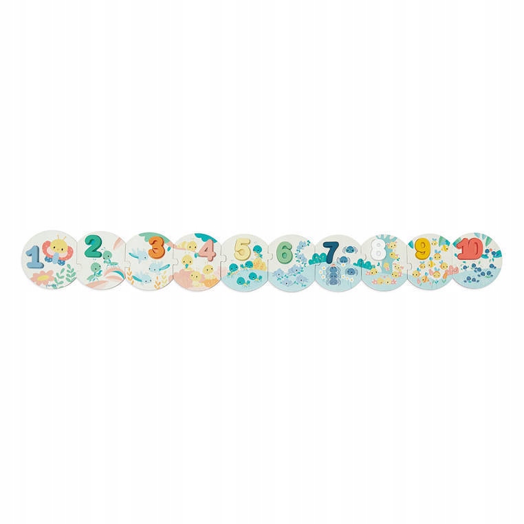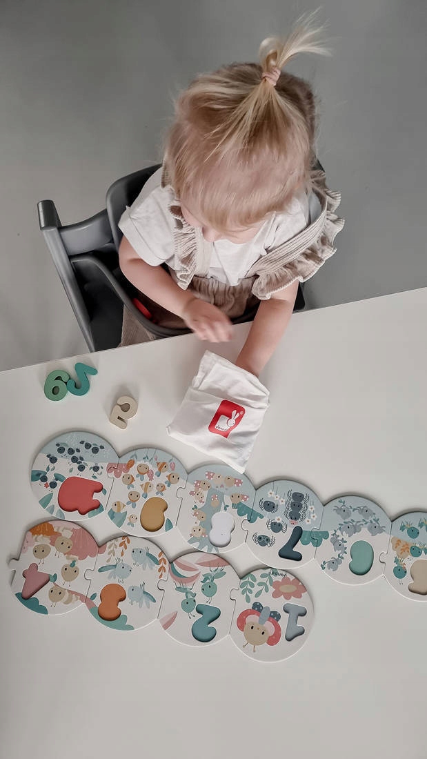Пазли з дерев'яними цифрами серії Pure французького бренду JANOD - це великий (більше метра) пазл, який допоможе вашій дитині навчитися рахувати та розпізнавати числа від 1 до 10. Складається з 20 елементів: 10 круглих картонні пазли, які потрібно з’єднати між собою в правильному порядку та 10 дерев’яних просторових чисел, які потрібно розмістити у відповідних місцях на цих дошках для пазлів. На дошках, оформлених у пастельних тонах, також є чарівні ілюстрації комах (зокрема, цвіркунів, мурах, павуків і сонечок) у кількості, яка відповідає цифрі, яку потрібно розмістити на даному елементі. Великі розміри і прості форми дозволяють легко комбінувати елементи. У набір входить зручна сумка на шнурках для зберігання головоломки.