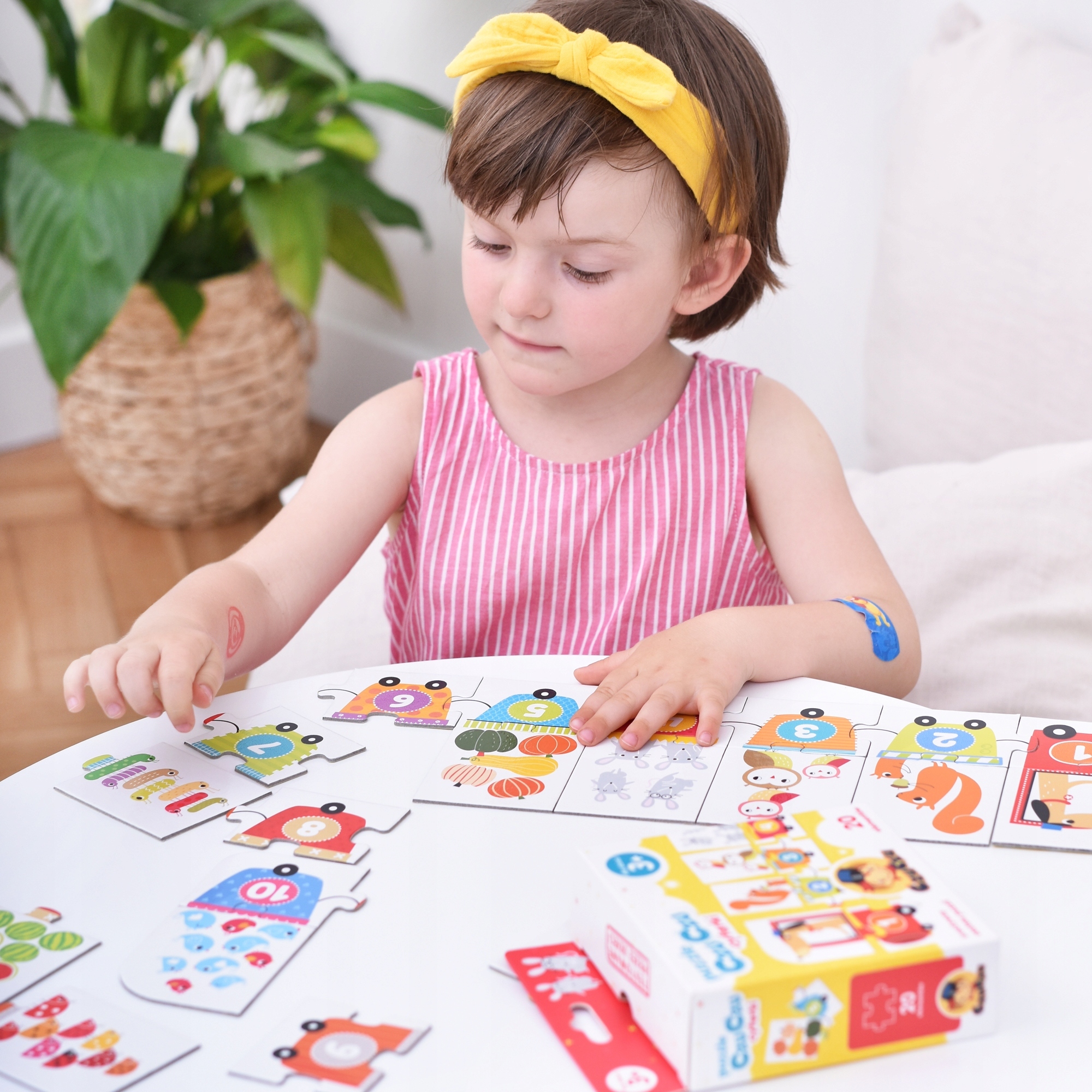 Розкладіть пазли та подивіться, які пасажири та вантажі чисельні поїздні перевезення. Ви також можете разом потренуватися рахувати до 10.