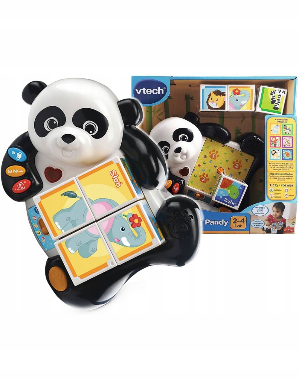 – це інтерактивна головоломка для дітей, яка має аж 3 режими гри, наприклад як: головоломки, мелодії та безкоштовні розваги. У набір входять 4 блоки, за допомогою яких можна розставити 6 різних тварин. Панда впізнає тварину на кожному блоці та розповідає смішні історії польською мовою, поки дитина розставляє блоки. Крім того, в іграшці є кнопки з тваринами та цифри, які допоможуть дитині знайти першу букву кожної тварини.