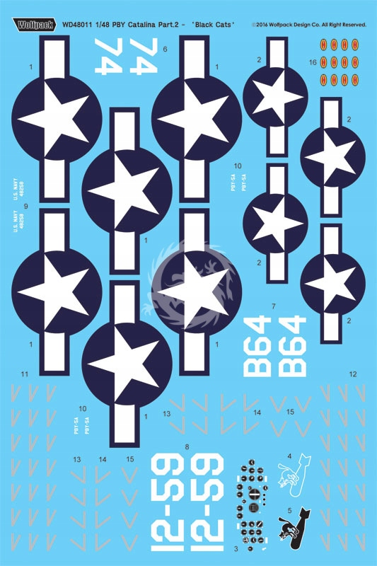 Набір наклейки для моделей консолідованої PBY-5 Catalina (частина 2), Wolfpack за шкалою 1/48. Набір включає килимовий аркуш з 3 варіантами для моделей Revell Catalina, інструкцій, 1/48 шкали.