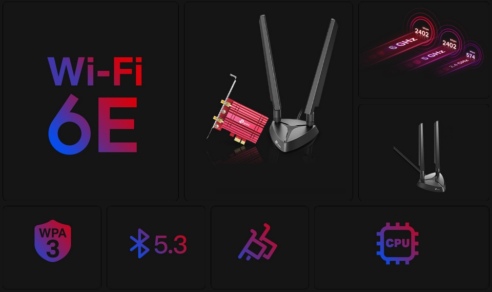 Archer TXE75E надає вашому комп’ютеру доступ до нещодавно відкритого діапазону 6 ГГц і повний потенціал маршрутизатора Wi-Fi 6E. Насолоджуйтесь безперервним потоковим передаванням у діапазоні 6 ГГц - ексклюзивно для пристроїв Wi-Fi 6E. Це запобігає падінню швидкості та перешкодам від старих пристроїв. Забудьте про падіння швидкості та перешкоди від старих пристроїв.