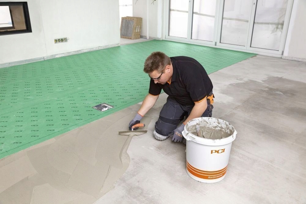 Покладіть PCI Pecilastic E mat на підкладку та відріжте потрібну частину на підготовлену поверхню 4-мм або 6-міліметровим клейовим розчином основу за допомогою зубчастого шпателя. У разі ангідридних стяжок із залишковою вологістю від 0,5 до 2,0% CM ізоляцію PCI Lastogum можна використовувати як клейовий розчин, який наноситься зубчастим шпателем 4-6 мм або товстим шаром пензлем чи валиком. Наклейте наступні частини килимка (зеленою стороною вгору) і притисніть їх гумовим валиком. По контактних осях наклейте самоклеючу паперову стрічку шириною 2 мм. Після застигання клейового розчину під матом можна приступати до наклеювання на нього плиткового покриття, використовуючи гнучкий клей PCI та розчини для швів, що відповідають типу покриття та умовам використання.