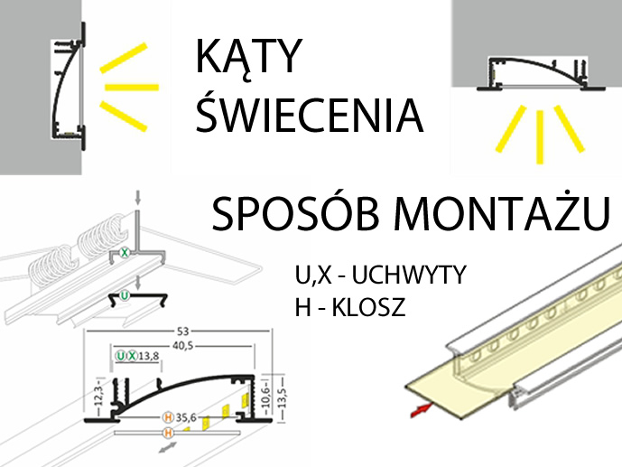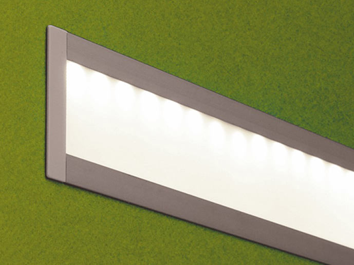 Профілі використовуються для монтажу світлодіодних смуг. Вони полегшують встановлення світлодіодів у стільниці, полицях та стелажах. Профілі виготовлені з алюмінію, мають естетичний вигляд і тому можуть бути декоративним елементом. Плоский - надзвичайно плоский профіль канавки. Глибина вставки становить лише 12,3 мм, що забезпечує ідеальне пристосування до структури гіпсарної дошки, не порушуючи її. Продукт був розроблений для досягнення ефекту розсіяного, гладкого і навіть світлого. Він може бути встановлений на меблі, стіни, плінтуси, використовуючи дужки (натиснувши) або безпосередньо (викручуючи або склеюючи). Профіль дозволяє створювати легкі лінії в стіні. Для використання з світлодіодними смужками до 8 мм шириною.