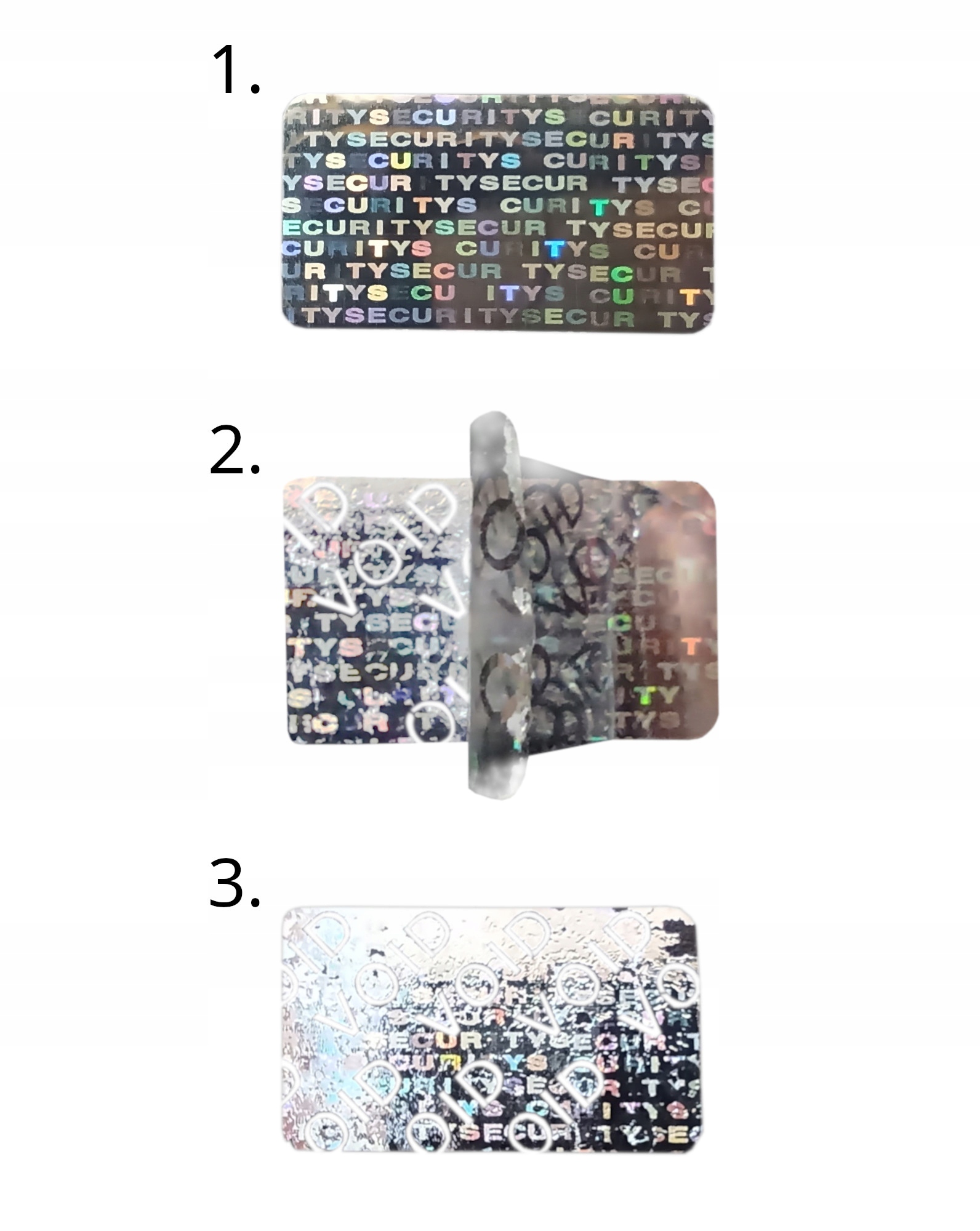 3. Видалена печатка НЕПРАВДІЛЬНО - Коли ярлик видалено, на предметі залишається срібляста позначка. Пломбу неможливо наклеїти повторно, зовнішня прозора фольга залишається без клею