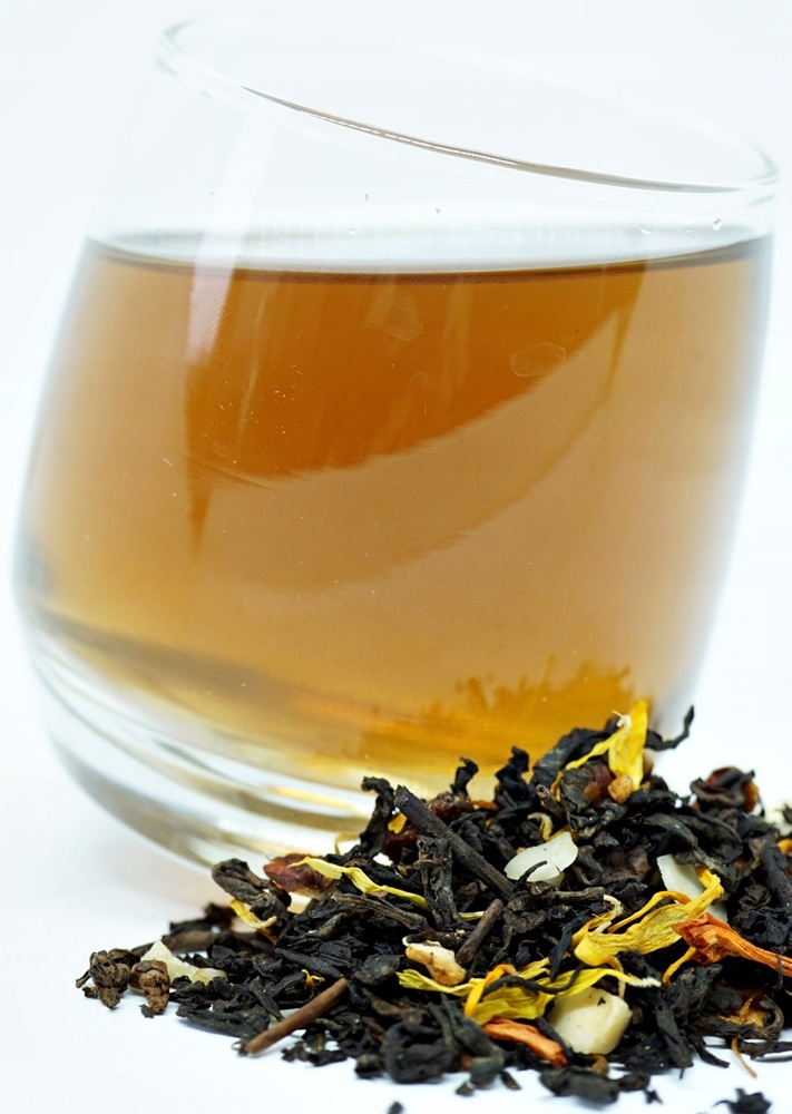 СКЛАД: червоний чай пуер, яблуко, лісовий горіх, мигдаль, родзинки, шоколад, квітка лілії, чорнобривці.