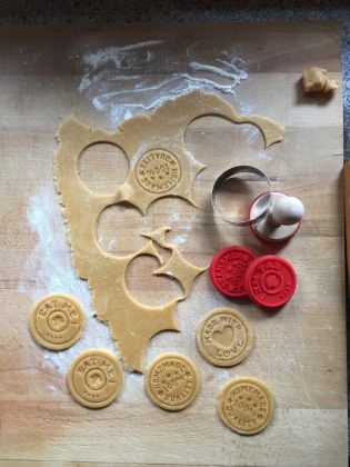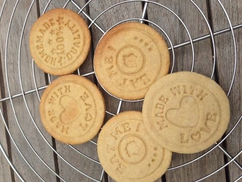 - Набір штампів для печива, що складається з дерев’яного штампа, 3 силіконових головок і відповідного кільця для печива + додатковий рецепт (німецькою мовою)
