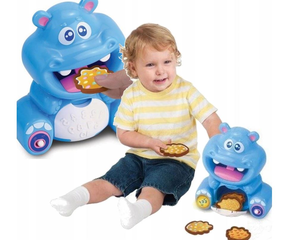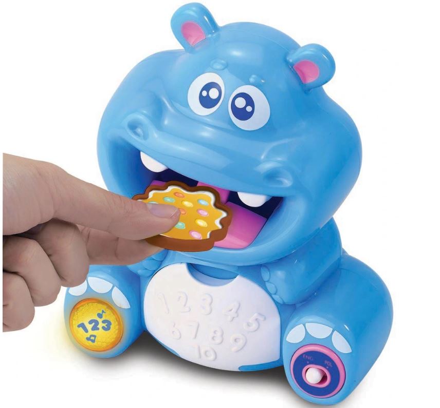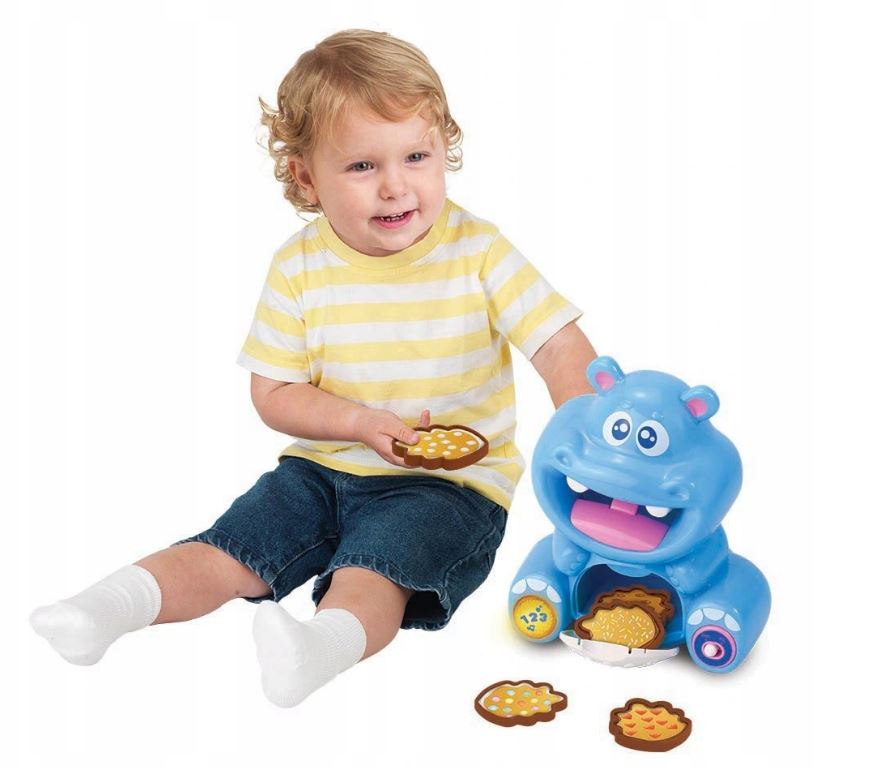- Коли дитина натискає ніжкою, вона починає гру в рахунок і чує веселі звуки та мелодії. Нагодуйте бегемота та скажіть йому, скільки печива він може з’їсти.