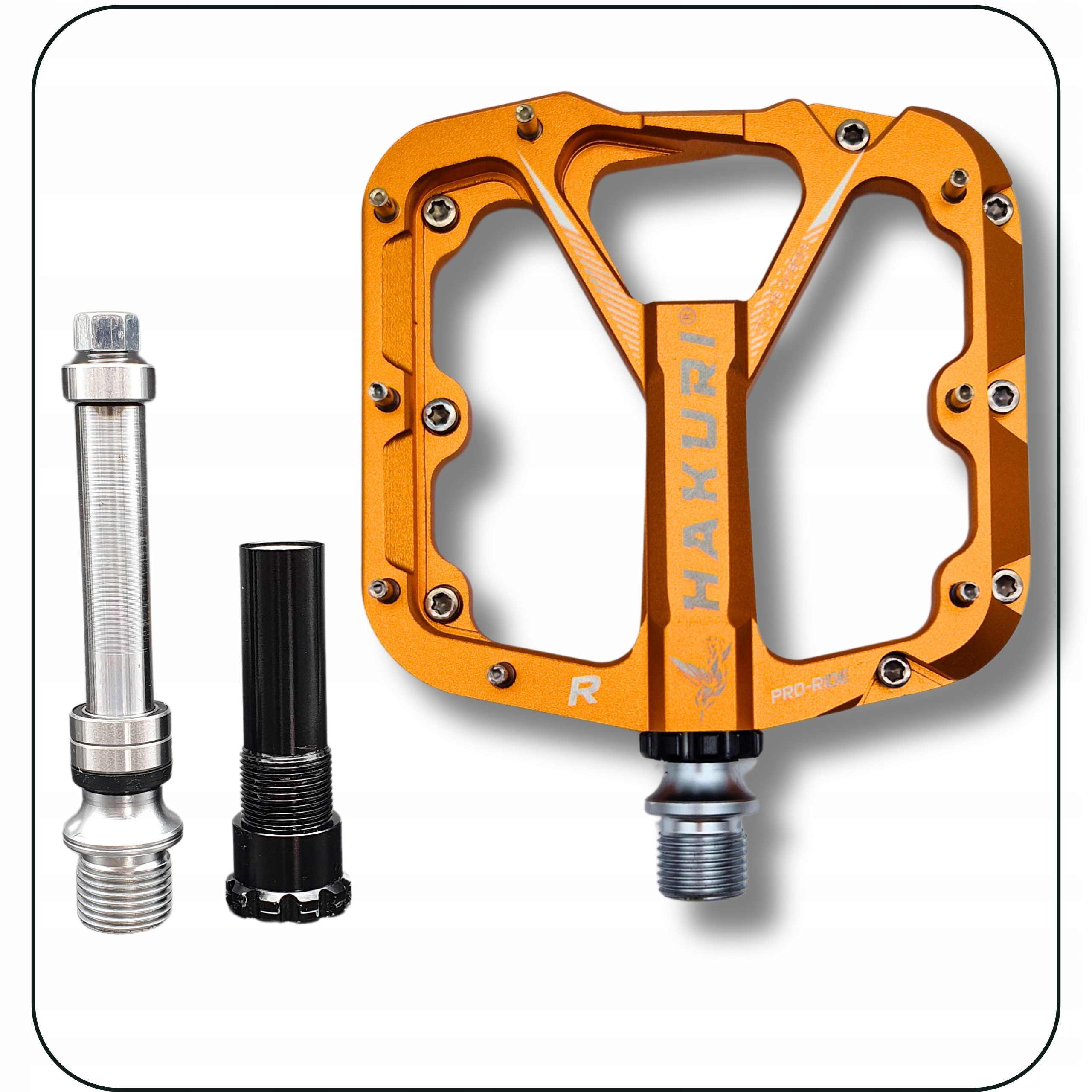 HAKURI PRO-RIDE – це педалі на платформі, призначені для катання на гірських трасах, альпіністів, ендуро, трейлів і гірських велосипедів. Виготовлений з алюмінієвого корпуса з вісьмома штифтами з кожного боку забезпечує чудову підтримку та зчеплення.