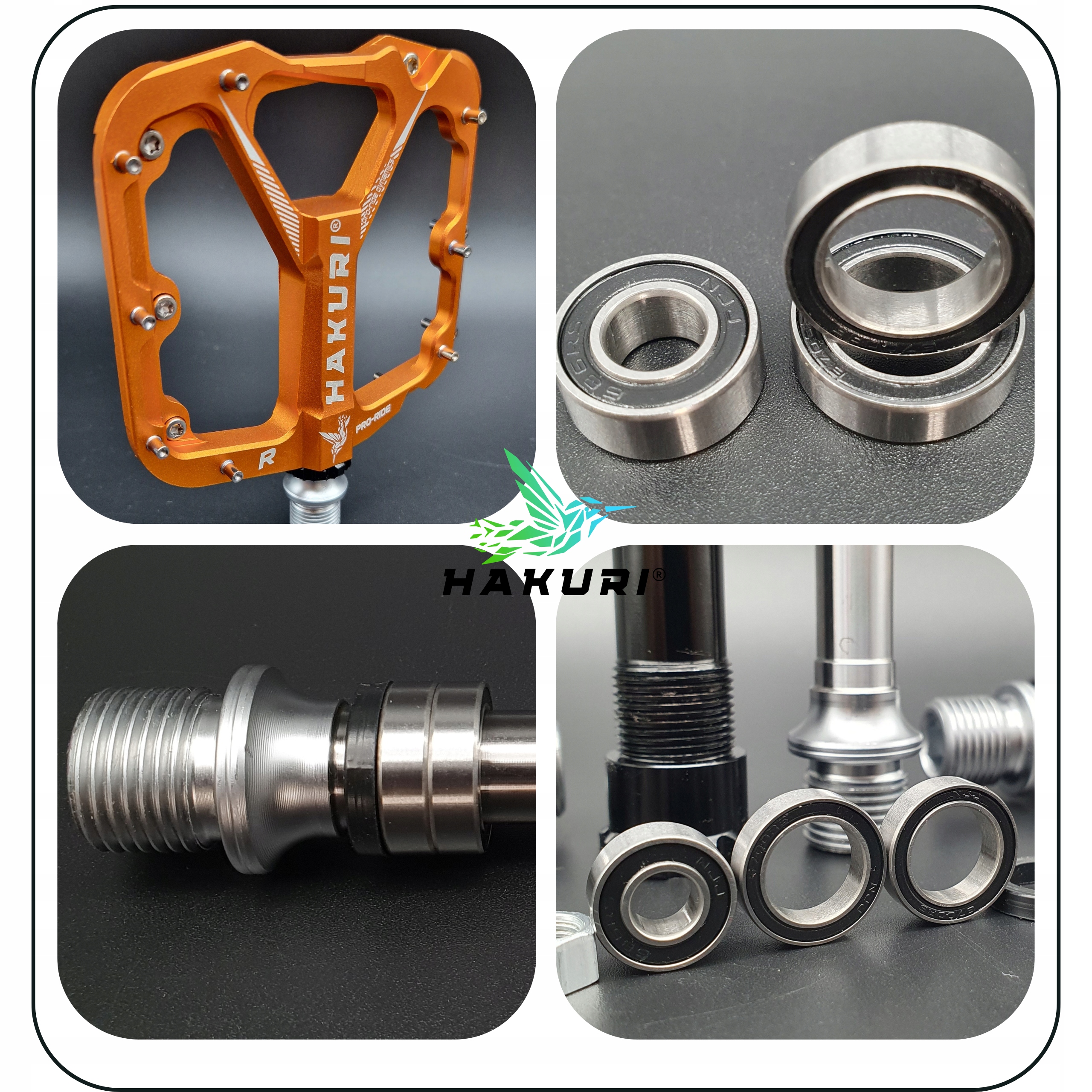 У педалях HAKURI PRO-RIDE DYNAMICS підшипники є важливим елементом і безпосередньо впливають на термін служби педалей. Педалі PRO-RIDE мають три добре герметичні картриджні підшипники, які дуже стійкі до погодних умов і не потребують обслуговування.