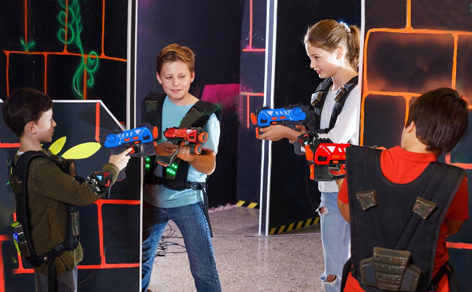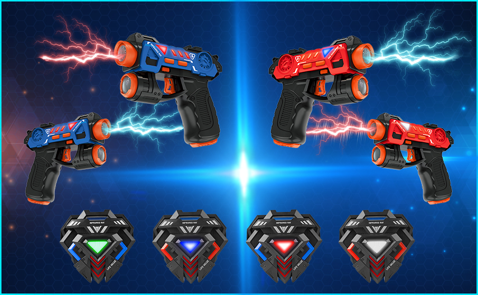 - ⭐Набір лазерної зброї включає 4 рушниці та 4 значки. Багатокористувацька гра робить командну роботу дуже важливою. У цій захоплюючій битві можуть брати участь до 4 команд, що збільшує складність гри.