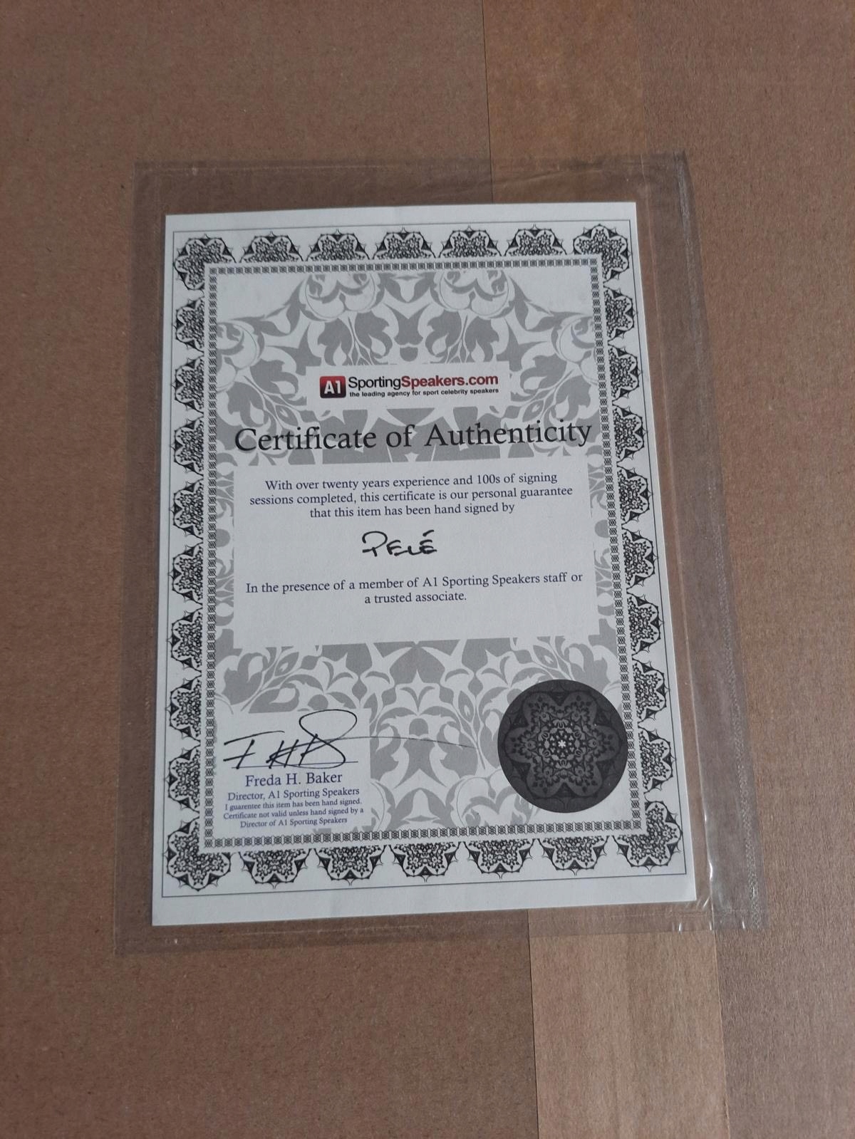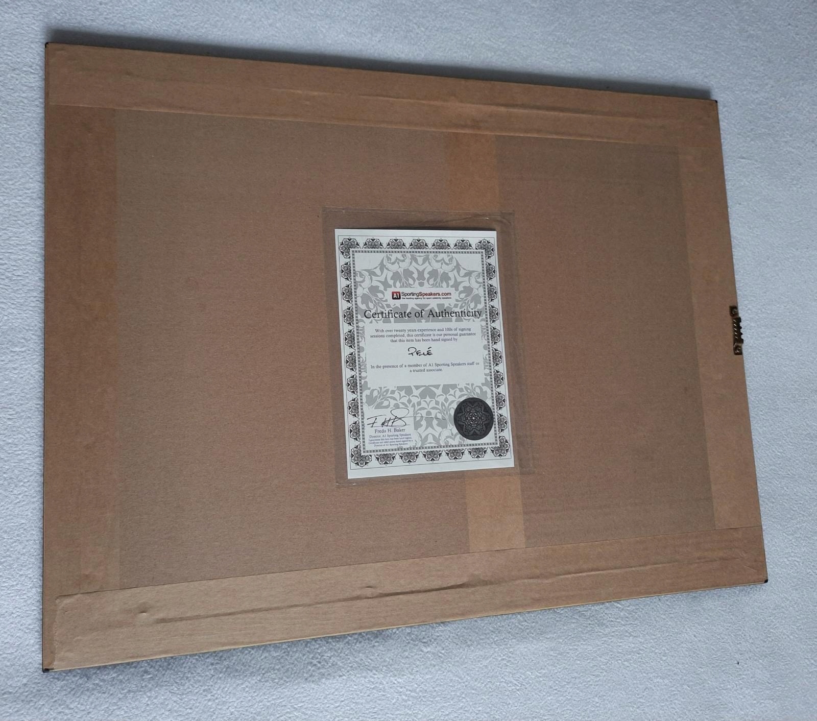 PELE - велике фото з рукописним автографом легенди + СЕРТИФІКАТ. Ідеально підходить для демонстрації в рамці для власної колекції або як унікальний подарунок для близької людини. Він має сертифікат автентичності COA.