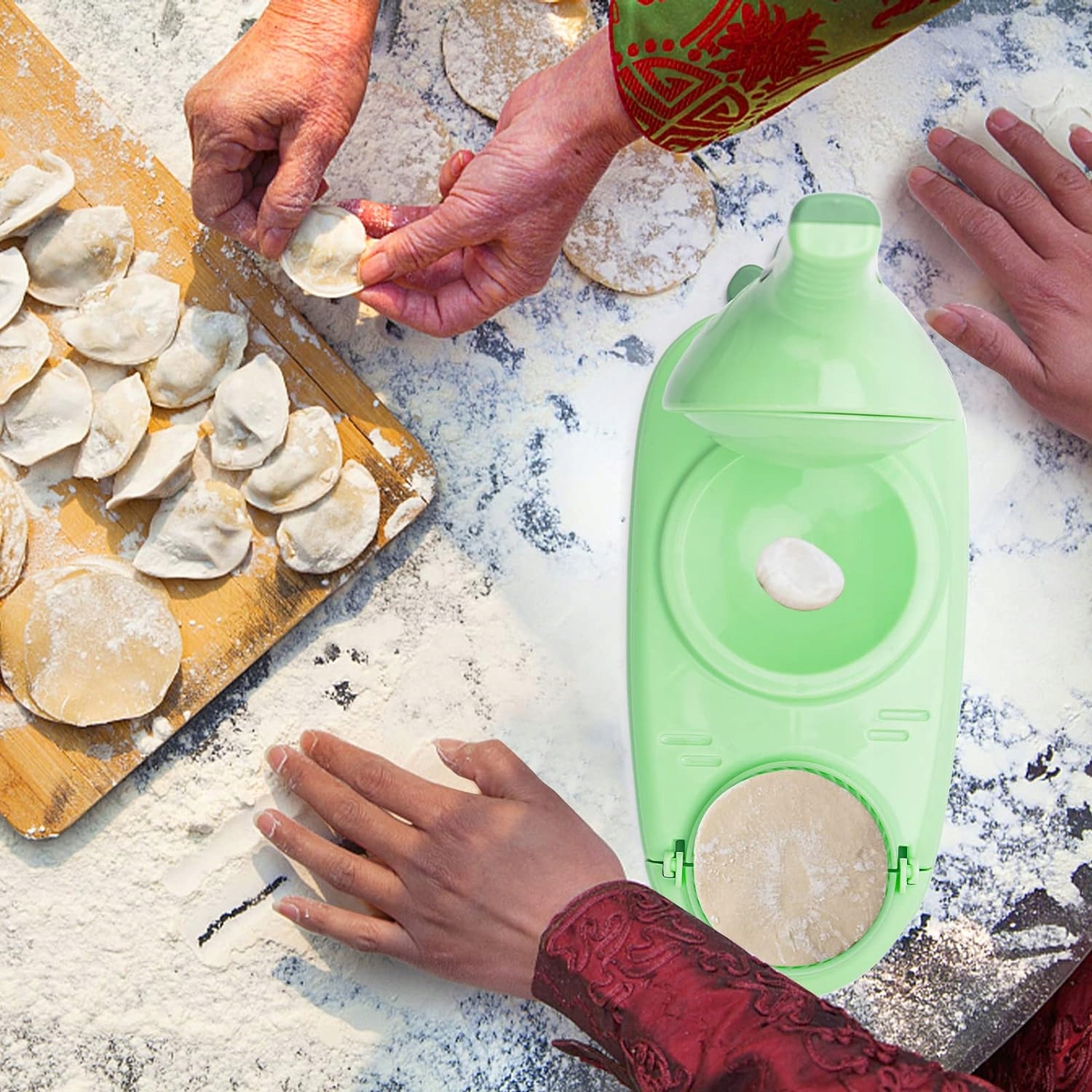 ✔️ Оснащений спеціальними колесами, які дозволяють рівномірно притискати та нарізати тісто, забезпечуючи ідеальні форми вареників.