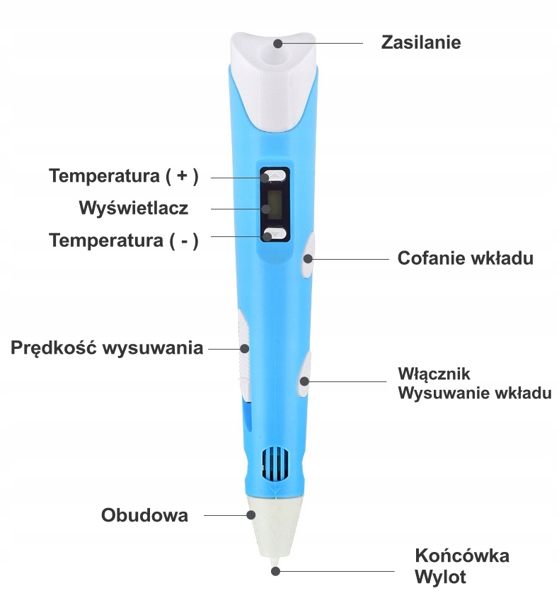 3D-ручка має РК-дисплей, який показує поточну температуру сопла 3D-ручки. Завдяки цьому ми можемо регулювати кількість градусів для кожного матеріалу, з яким ми працюємо, наприклад, різну температуру для PLA нитки розжарювання та іншу для ABS. p>