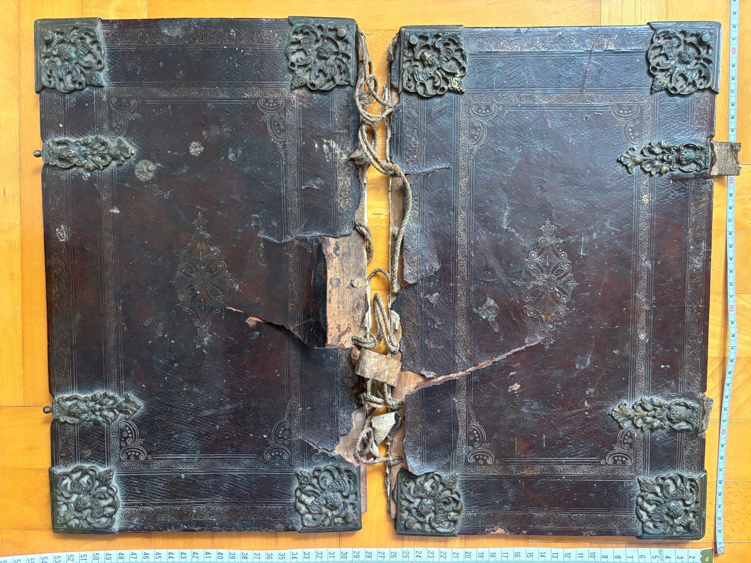 стара, повна обкладинка; шкіра, покрита шкірою; натиснута візерунка; повний набір металевих фурніонтів та кріплень; XVII або 18 століття.
