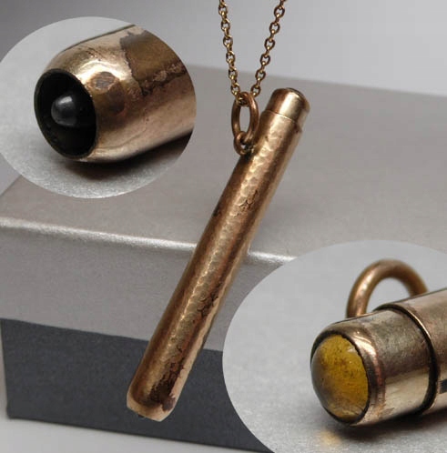 ПІДВІСКА ПІДВІСКА З ОЛІВЕЦЕМ ШЛАНГОМ. Кулон позолочений - позолота. Довжина 4,55 сантиметра, діаметр 6,3 мм. У верхній частині є пружинна «ґудзик» з жовтим каменем. При натисканні олівець виходить. Виріб виготовлено приблизно в 1930 - 1940 роках.