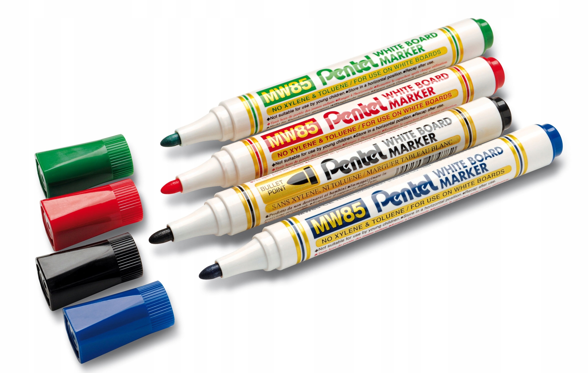 Круглий наконечник плавно та легко пише білий простір лінією товщиною 1,9 мм у чотирьох кольорах на вибір: червоному, зеленому, синьому або чорному, при цьому кольори, насичені глибоким пігментом, видно з найвіддаленіших куточків конференц-залу. .