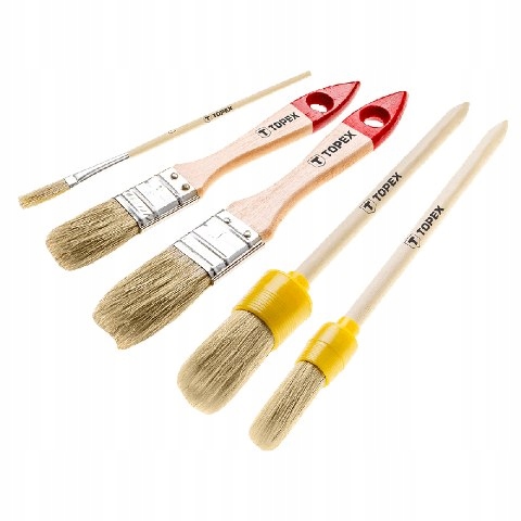 Набір пензлів Topex (посилання 20B816) включає 5 пензлів, включаючи 2 плоскі щітки в розмірах 1 "та 1,5", овальні пензлі № 2 та 4 та міні -щітки. Це пензлі з універсальним використанням. Набір пензлів Topex буде корисним під час невеликих робіт з фарбування та ремонту. Марек Топекс спрямований на "Зроби сам".