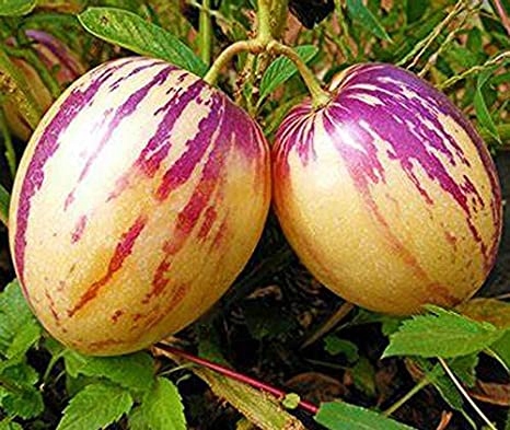 ягоди мають яйцеподібну або серцеву форму і кремово -жовтий колір з фіолетовим або червоним - коричневими смугами.