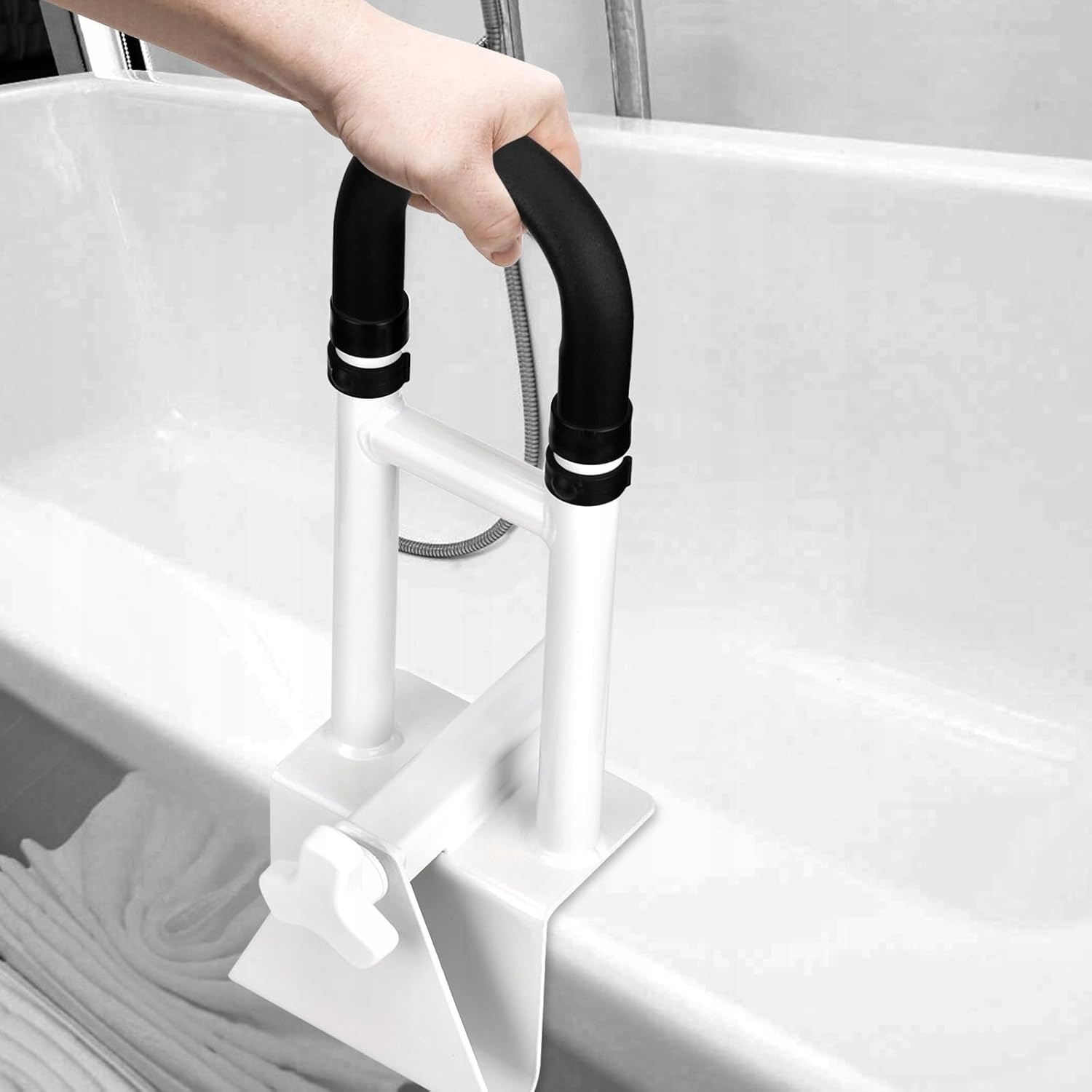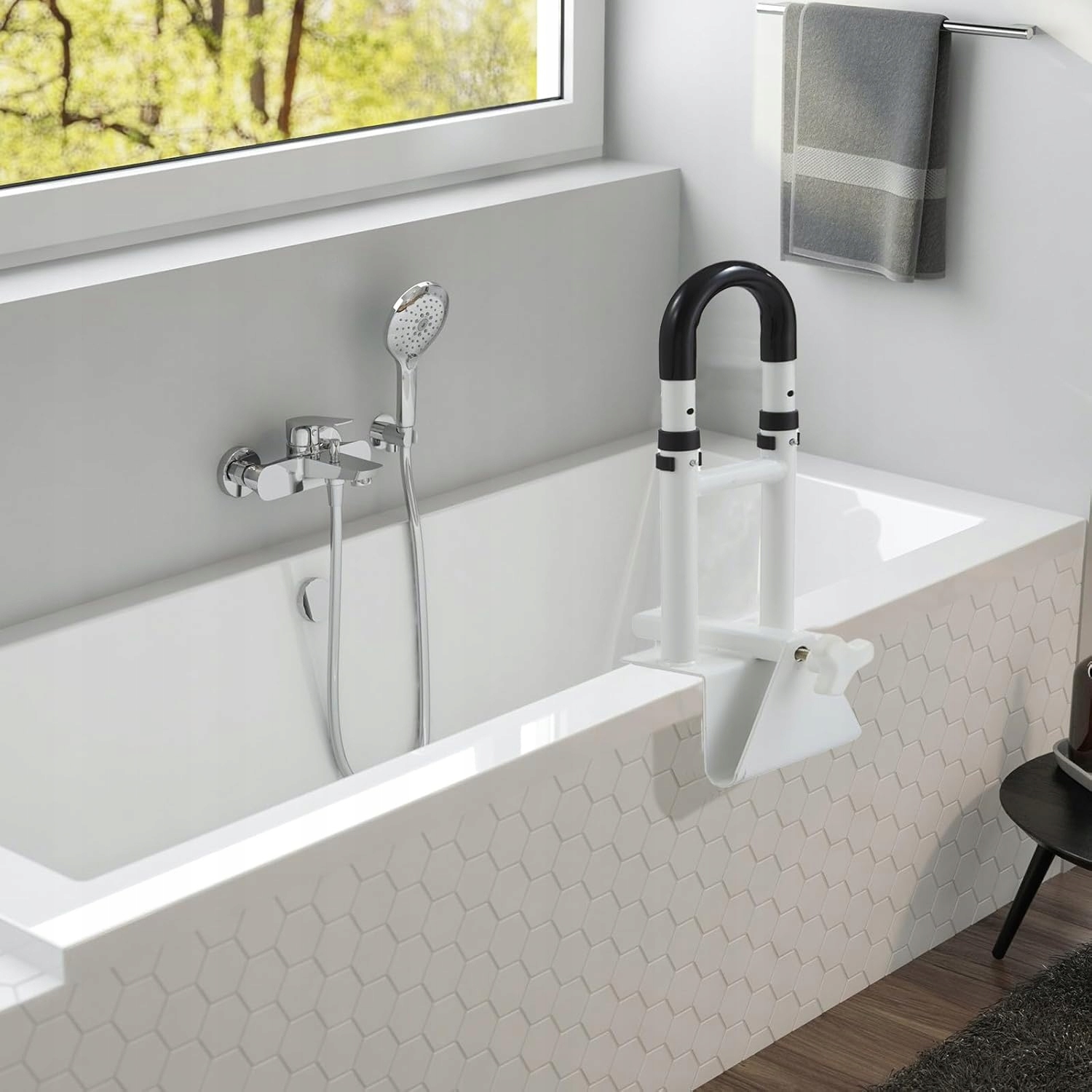 допоміжний пристрій для входу у ванну розроблено для підтримки та стабільності, а також для безпечного входу та виходу з ванни через точку підтримки, підвищуючи автономність користувача та якість життя. Поручні ванни виготовлені з міцної вуглецевої сталі та мають максимальну вантажопідйомність 120 кг. Лакове покриття забезпечує стійкість до іржі та гарантує міцне, безпечне та довговічне утримання.