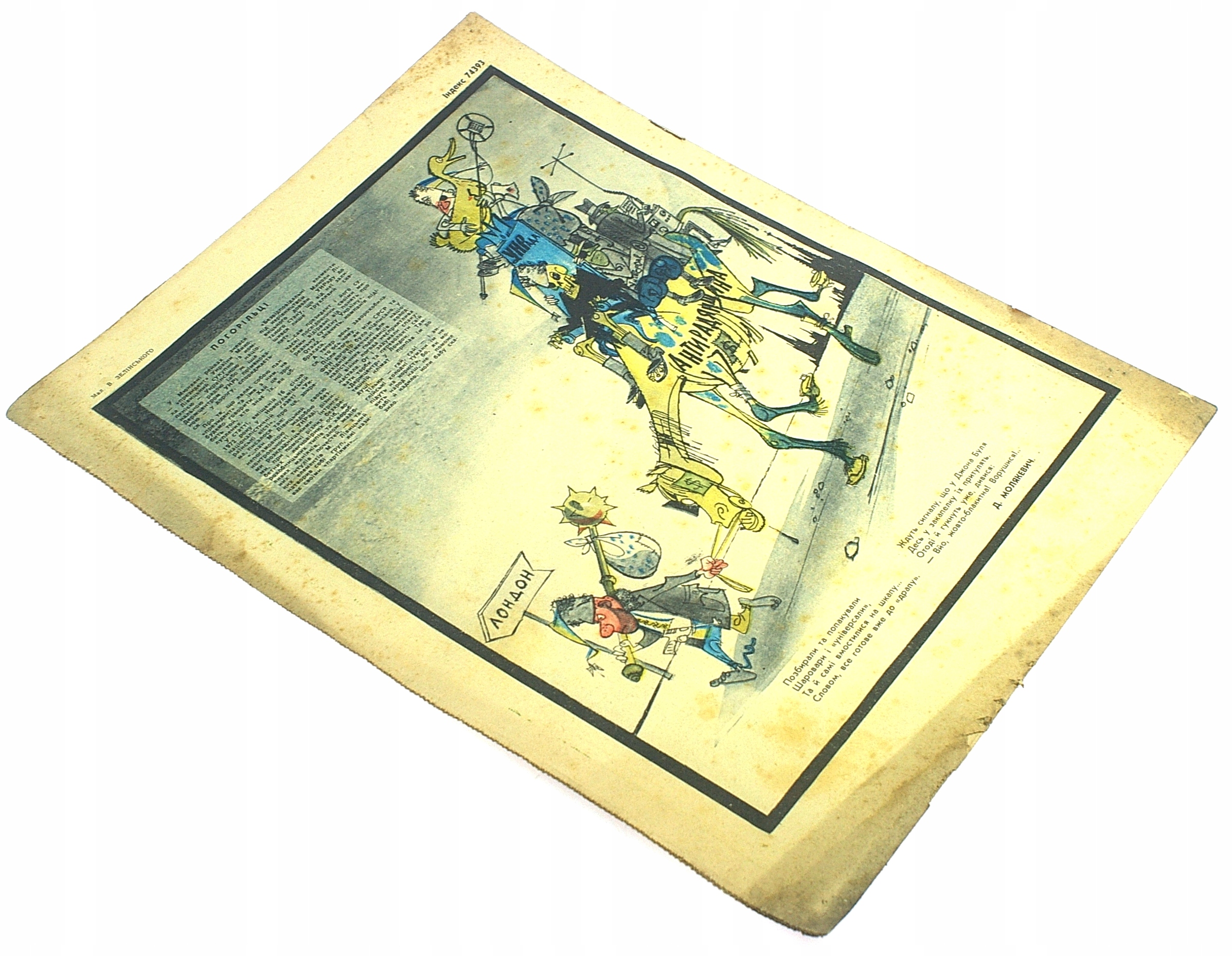 Вона була спрямована проти країн Заходу, використовуючи гострі лінії і чудові малюнки провідних радянських ілюстраторів, показувала падіння, бідність і лицемірство капіталістичних країн. Конкретними цілями атак були США, Ізраїль, Німеччина та Велика Британія, а частими героями ілюстрацій були Гітлер, Черчилль, Ейзенхауер, дядько Сем, різні президенти та керівники капіталістичних країн. Пропаганда виробила і закріпила в радянській свідомості образ західної людини як товстуна, найчастіше в циліндрі (або в уніформі і в чорних окулярах), нашпигованого доларами бізнесмена, шулера, торговця зброєю, що збагачує. сам за рахунок бідних, шахрай, якого зазвичай показують у супроводі бомб, призначених для скидання на Радянський Союз, у змові з Гітлером чи Ізраїлем.
