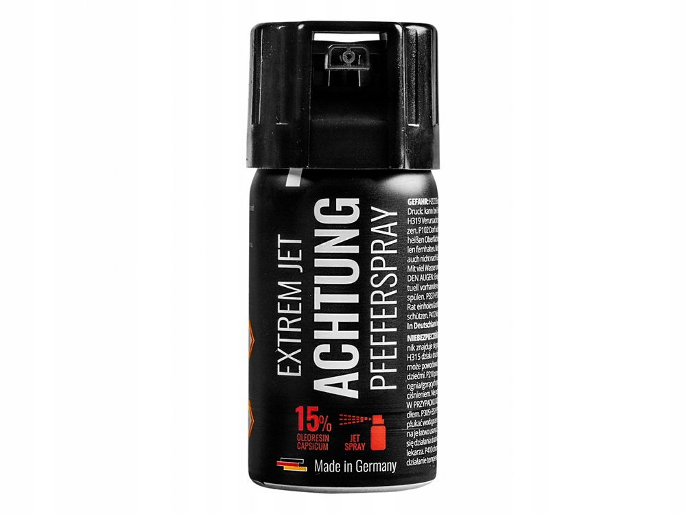 Achtung eXtrem Jet 15% OC 40 мл - це ефективний перцевий балончик із радіусом дії 4 метри, який виділяє активну речовину у вигляді концентрованого потоку 15% концентрація капсаїцину (Oleoresin Capsicum). Газ дуже зручний і Ви можете легко носити його в жіночій сумочці або кишені. Є це законний засіб самозахисту з тимчасовою недієздатністю. Зловмисник, оброблений газом, має обмежене поле зору та відчуття задишка і сильне печіння шкіри, що викликає сплутаність свідомості, під час якого він не може вжити скоординованих дій.