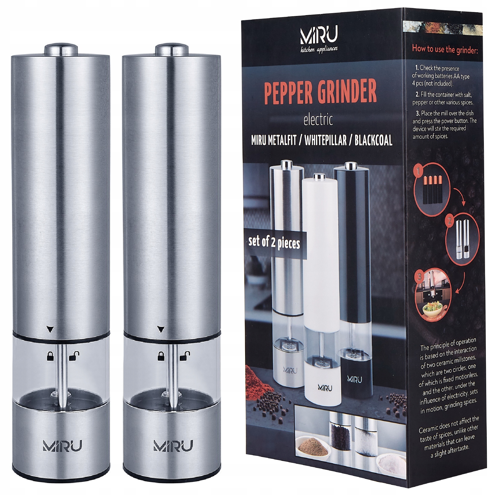 Електрична млинка для спецій - це не тільки зручний і потрібний інструмент на кухні, а й ефектне і стильне доповнення, яке збагатить інтер'єр вашої кухні. Поєднайте сучасний стиль і зручність із подрібнювачем солі та перцю MIRU.