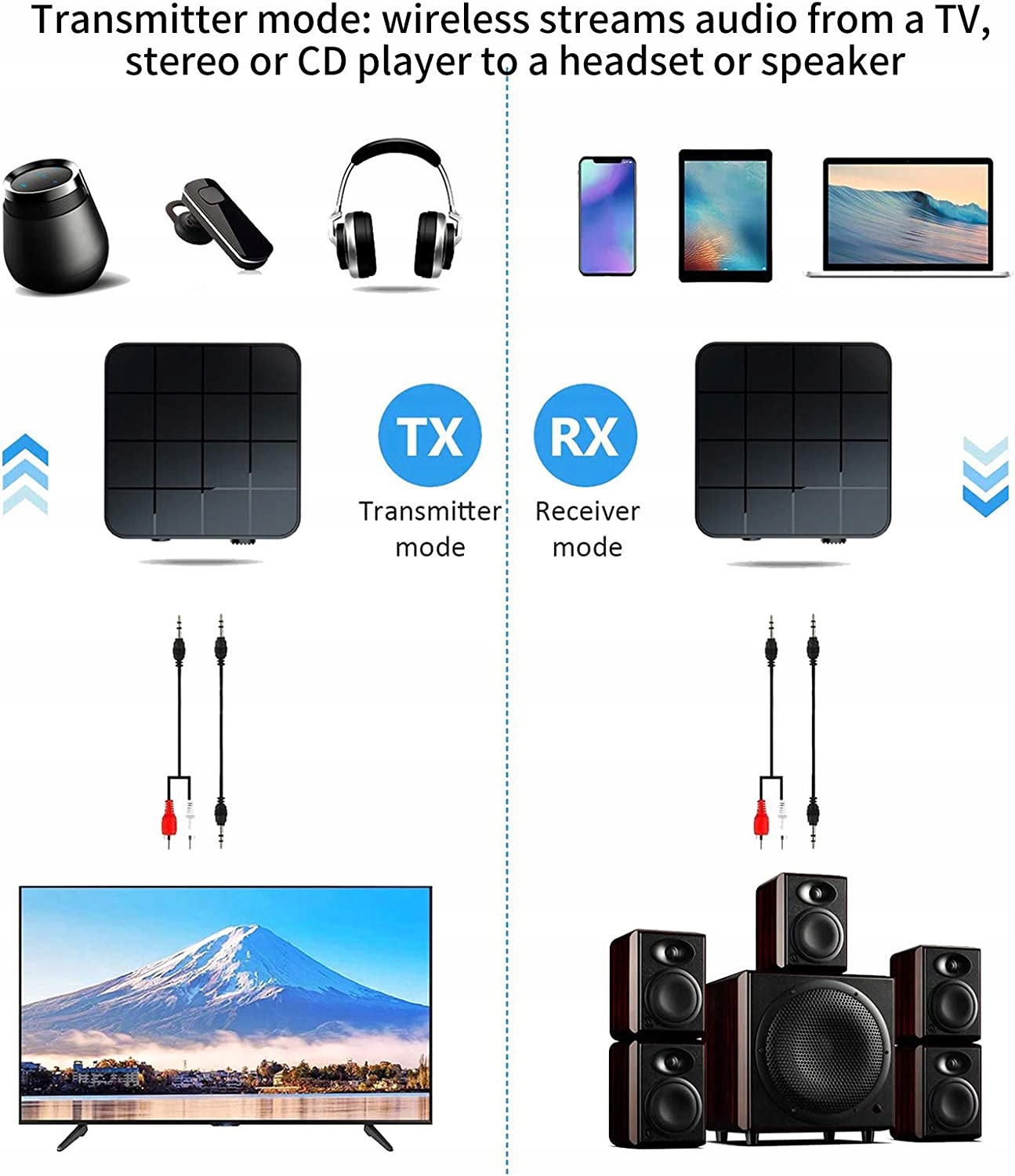 - У режимі передавача звук від телевізора без Bluetooth, стереосистеми чи програвача компакт-дисків до гарнітури чи динаміка Bluetooth у режимі приймача, бездротового аудіо з телефонів, планшетів чи комп’ютерів із підтримкою Bluetooth до дротових стереосистем, динаміків чи гарнітур.