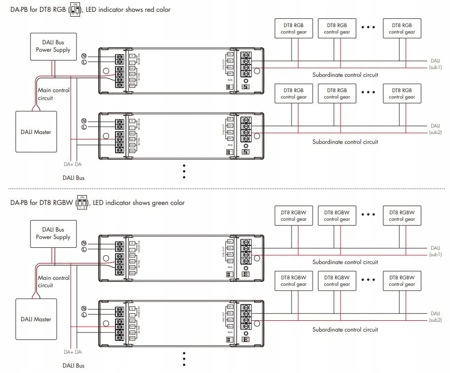 DA-PB - блок передачі з чотирма функціями (4 в 1), призначений для розширення ланцюгів освітлення, що працюють відповідно до стандартів DALI DT6 і DT8. Він сумісний з пристроями DALI інших виробників. Кожен блок передачі займає одну адресу DALI, і до однієї шини можна підключити до 64 блоків передачі. Він отримує команди DT6/DT8 від основної схеми DALI як одноадресний пристрій керування та пересилає отримані команди DALI до всіх блоків керування, підключених до DALI OUT, через команди передачі DALI. Адреса DALI передавача буде автоматично призначена головним DALI. Адресація DALI не потрібна для блоків керування, підключених до DALI OUT. Діапазон вхідної напруги 100-240VAC. Максимальний вихідний струм 200 мА.