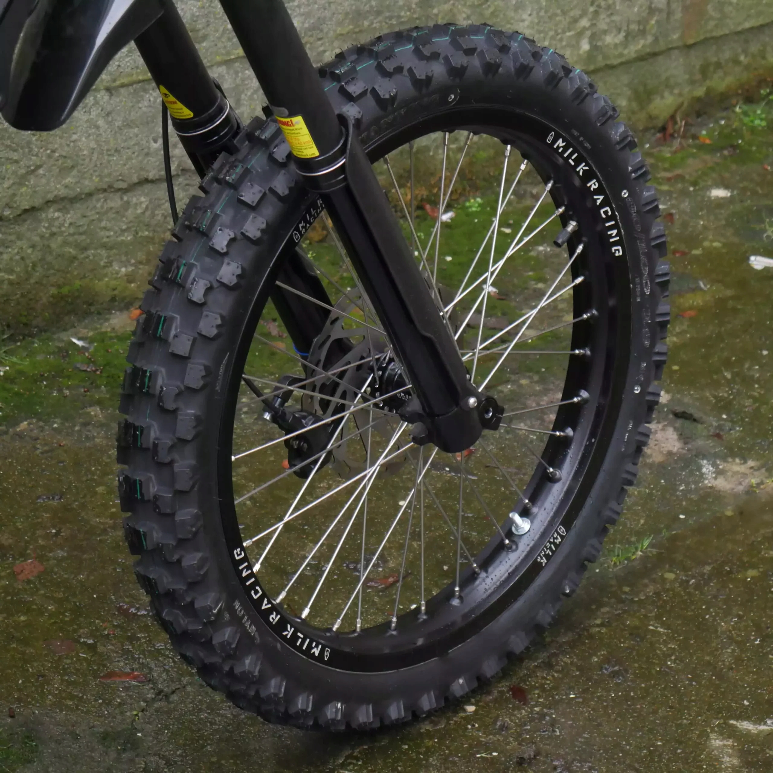 Переваги переднього колеса Milk Racing 18”x1,85 1. Ширший і міцніший обідок. 2. Ви можете бігати на дуже широкій шині з горбками, що забезпечує більше зчеплення. 3. Є більше варіантів шин на вибір - розмір обода 19"x1.4 не призначений для широких позашляхових шин. 4. Краще для їзди по трасі - ширша шина товща, тому ви можете бігати з нижчим тиском. Він більш стійкий до тиску. 5. Ширша шина більш гнучка, з нижчим тиском, краще зчеплення з твердою поверхнею. 6. Маточина краще штатної - ущільнена додатковими ущільнювальними кільцями. 7. Велосипед виглядає краще з товщими і ширшими колесами.