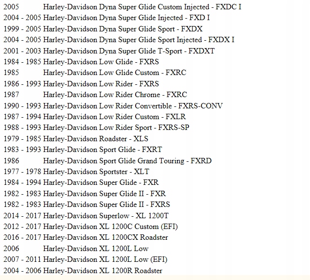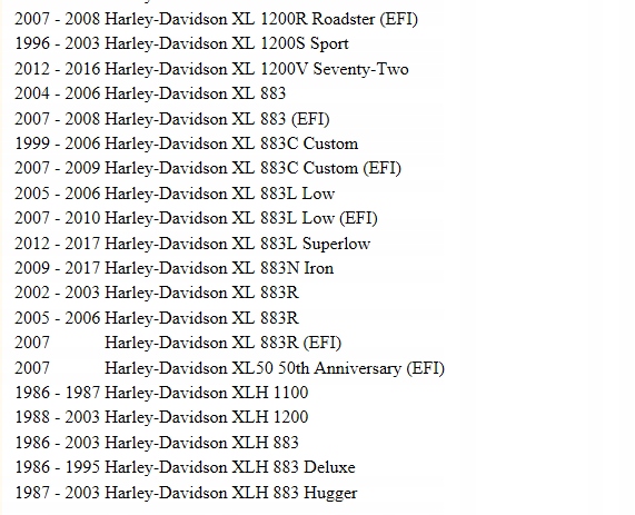 1000 Sportster XLCH, 1000 Sportster XLH, 1000 Sportster XLX, 1000 Sportster XR, 1000 Sportster Cafe Racer Glide FX, 1200 Super Glide FXE, 80 Fat Bob FXEF,