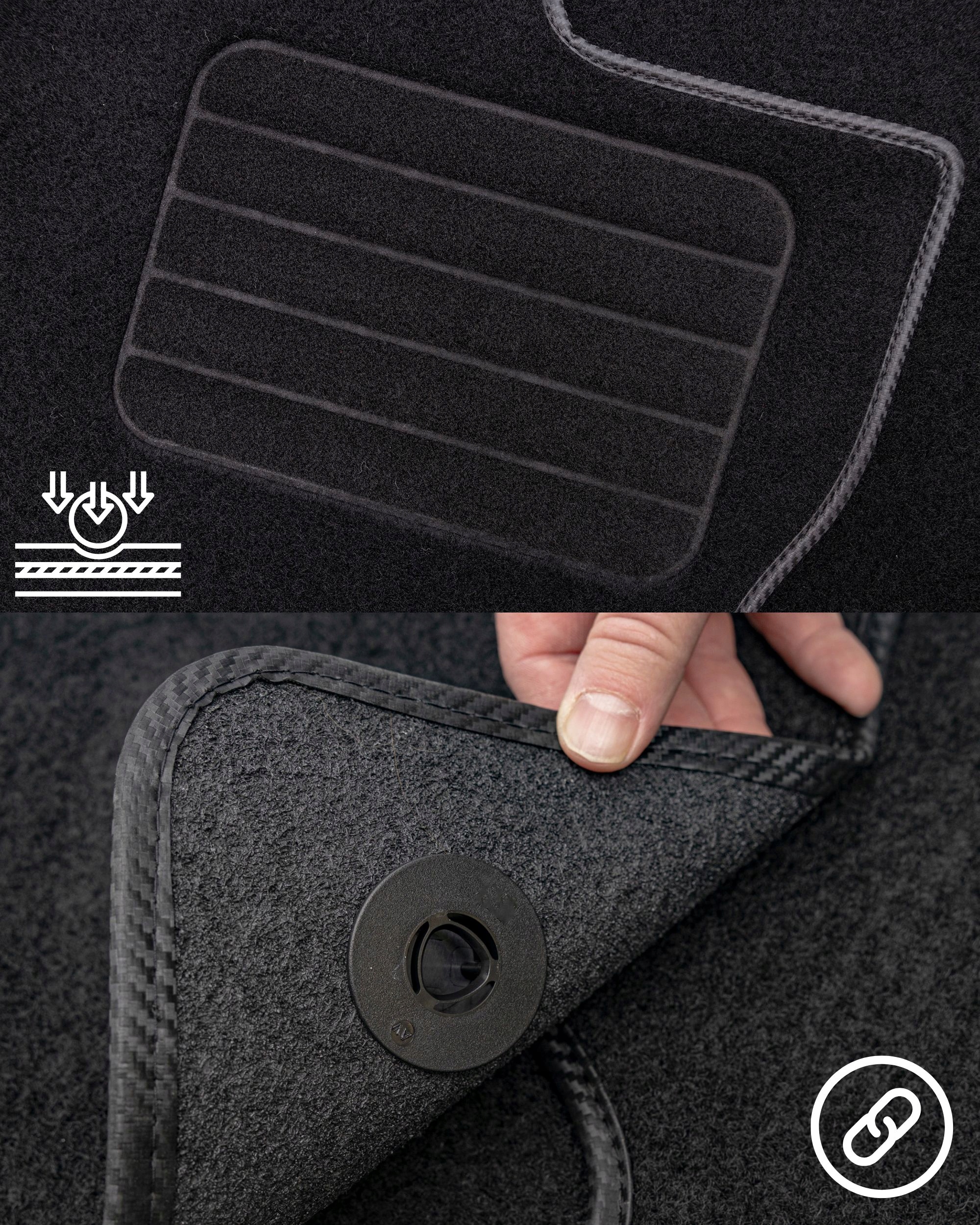 Наші автомобільні килимки завжди постачаються з монтажним набором, адаптованим до певної марки/моделі автомобіля. Килимок для водія завжди повинен кріпитися до підлоги автомобіля, а кріплення килимків для пасажира залежить від конструкції такого рішення виробником даної марки автомобіля.