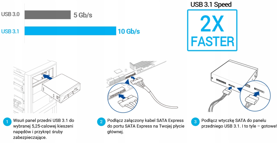 Передня панель для портів USB 3.1 легко вписується в будь-який стандарт 5,25-дюймовий відсік для дисків; Ви лише в трьох кроках від швидкості передавання 10 Гбіт/с: