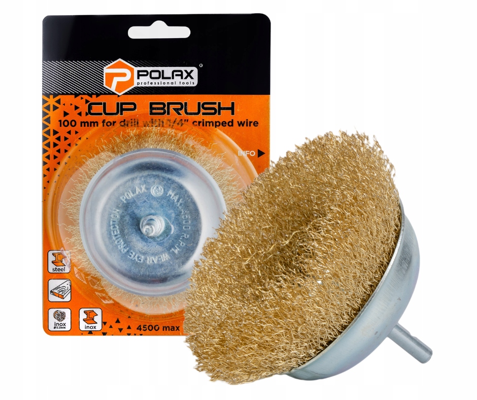 передня щітка Polax можна використовувати в наборі з будь -якими типами ручних та електричних свердла. призначений для швидкого очищення металевих та інших поверхонь та елементів із старої фарби, лаку, корозії, ознак природного старіння (патина), шарів фундаменту, в тому числі в місцях, що перебувають у складі. Продукт можна використовувати як в домогосподарстві, так і в різних галузях для очищення пристроїв та механізмів.