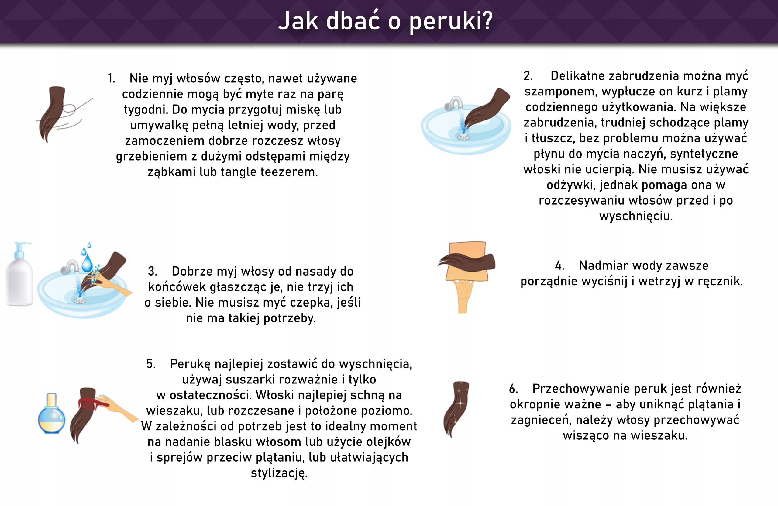 Як і кожне довге волосся. Незалежно від того, чи це природне, синтетичне, кучеряве або пряме волосся - Будь -яке довге волосся заплутається і може допомогти лише догляд та метод зберігання. Важливо носити з собою пензлик, розчісуватися до декількох разів на день, використовуючи метод повсякденного використання, зберігання, як набрав нижче в "Як піклуватися про перуки?" та специфіки аптеки, спеціально створені для використання проти заплутаного та полегшення розчісування.