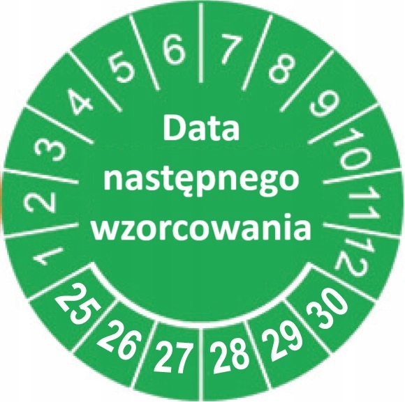 Етикетки типу-5, Ø 15 мм, напис у середній "дата подальшої калібрування", нижній літо 25-30, 12 місяців, зелена, 1 карта = 63 наклейки