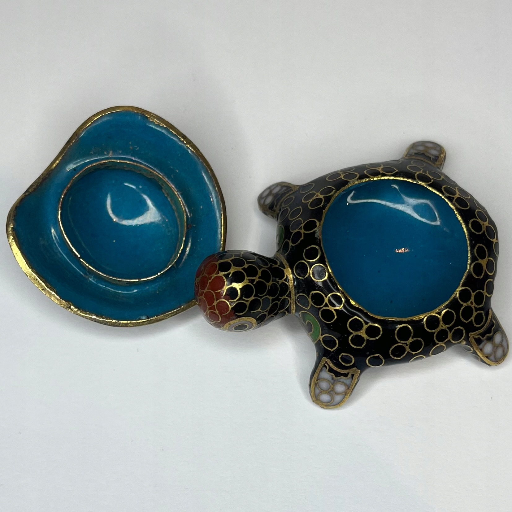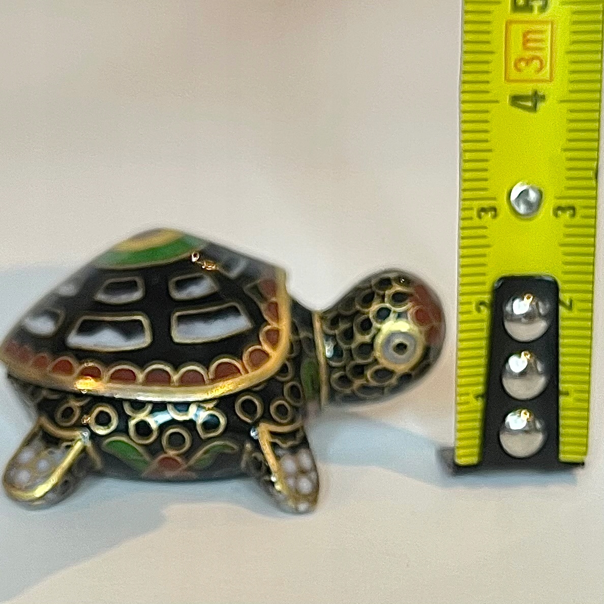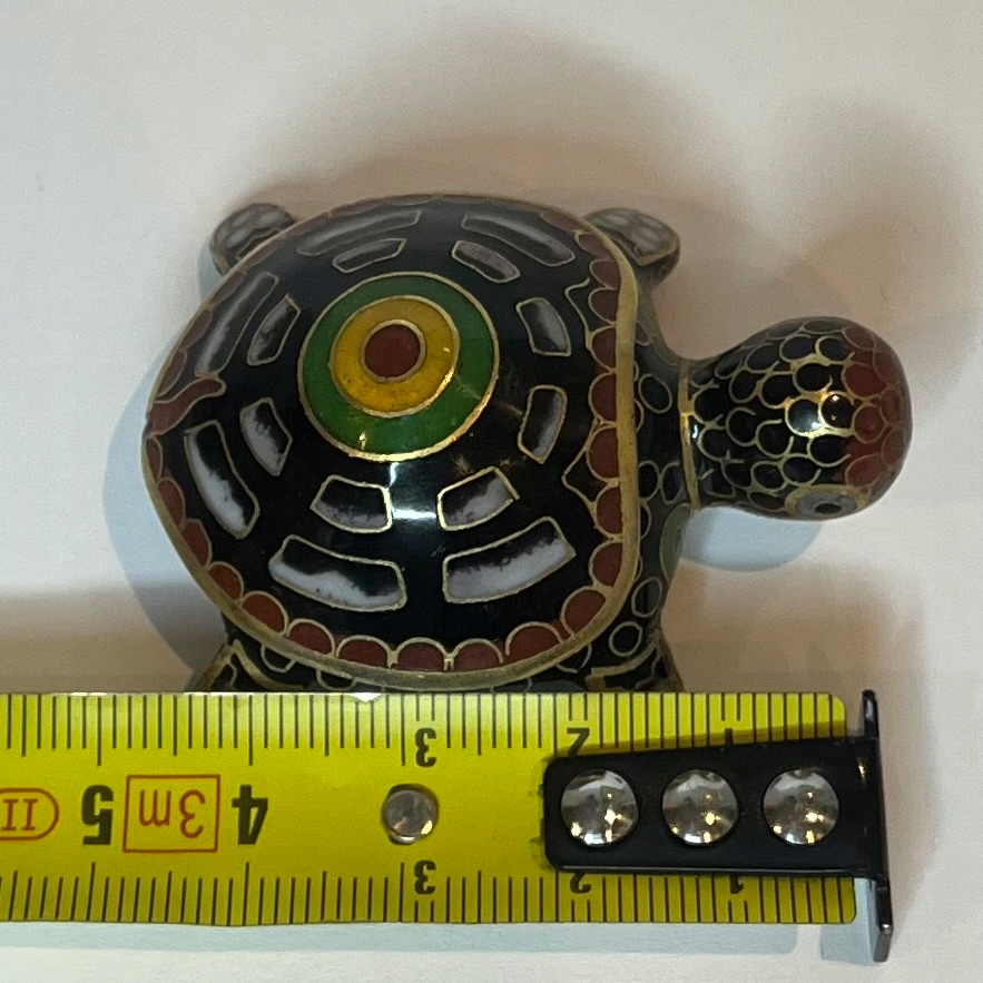 Декоративна шкатулка у формі черепахи, виконана в техніці перегородчасте - комірчаста емаль з характерними позолоченими контурами. Східний предмет азіатського походження, який служить невеликою скринькою.