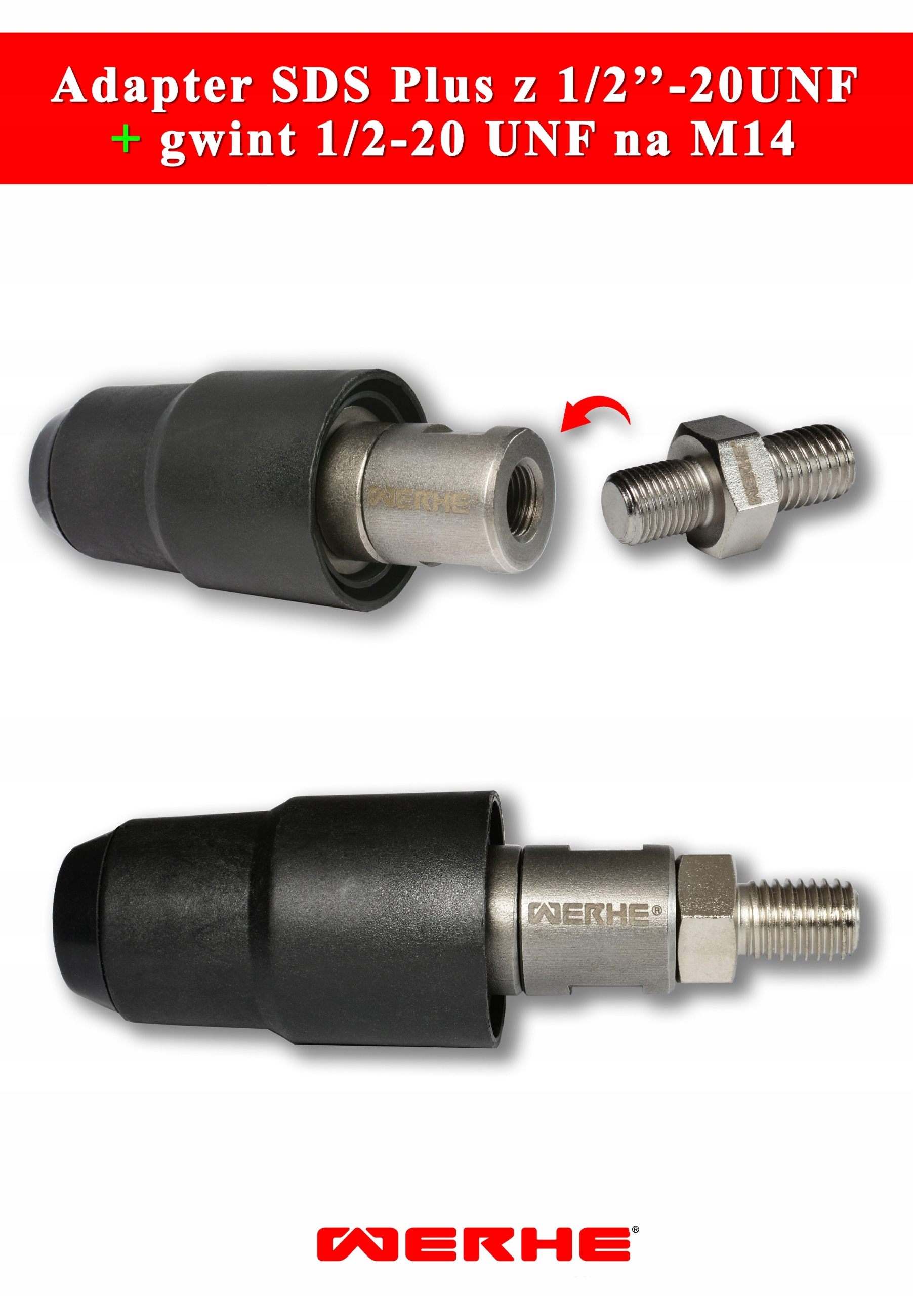 Адаптер дозволяє використовувати інструменти SDS Plus без свердла SDS Plus шляхом перетворення внутрішньої різьби 1/2–20 UNF. Ми можемо використовувати цей адаптер з будь-якою машиною, яка має зовнішню різьбу або інший аксесуар, який перенесе основну різьбу в цьому адаптері на інший. Прикладом такого аксесуара є перехідник 1/2-20 UNF на m14.