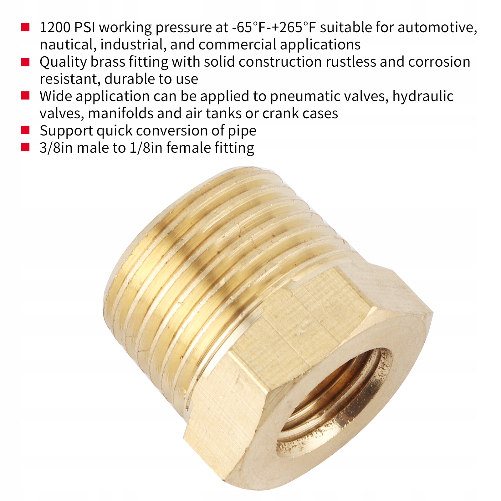 , що відповідає автомобільному, вітрильному, промисловому та комерційному додатках. 2. Високоякісний латунний роз'єм із суцільною конструкцією, стійкою до нержавіючої та корозії, продовжував використовувати. 3. Це допомагає швидко перетворити труб, дозволяє адаптувати різні розміри роз'ємів до танків, колекціонерів. Чоловічий роз'єм 4.3/8 дюймів для 1/8 дюймів, доступний у розмірах північноамериканських труб від 1/8 до 2 дюймів. 5. Широке використання може використовуватися для пневматичних клапанів, гідравлічних клапанів, колекціонерів та повітряних резервуарів або колінчастого валу. 6. Латунь для багаторазового використання, економічне та постійне рішення, яке відповідає вашим потребам у галузі трубопроводів та сантехніків. 7 Підтримуйте додаткове використання інших видів перенесення рідини та води, повітря та палива, які не варто пити.
